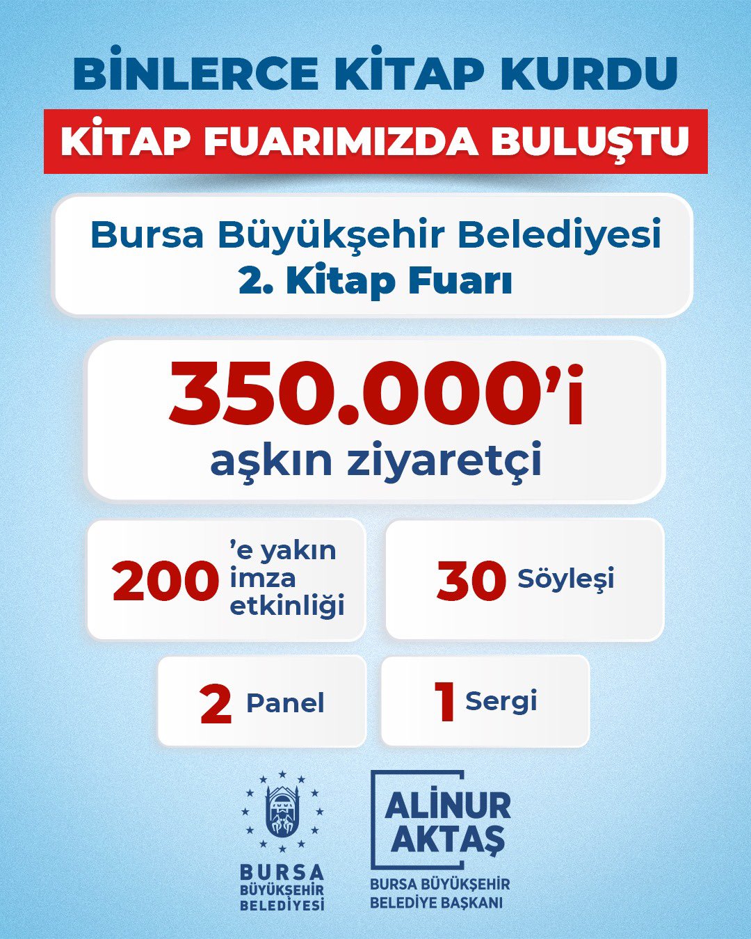 Bursa Büyükşehir Belediye Başkanı Alinur Aktaş, ikincisini düzenledikleri Kitap Fuarı’na katılımlarından dolayı Bursalılar’a teşekkür edip, rakamları paylaştı…