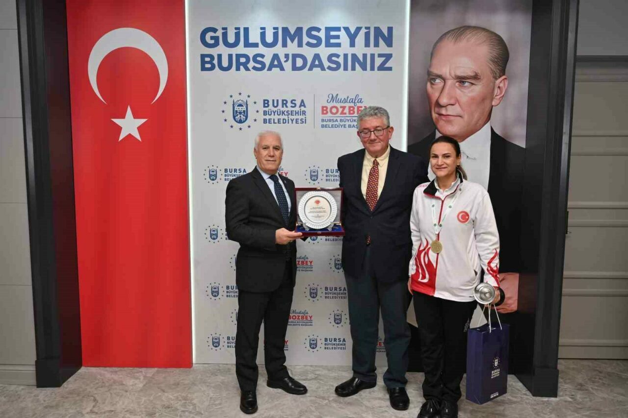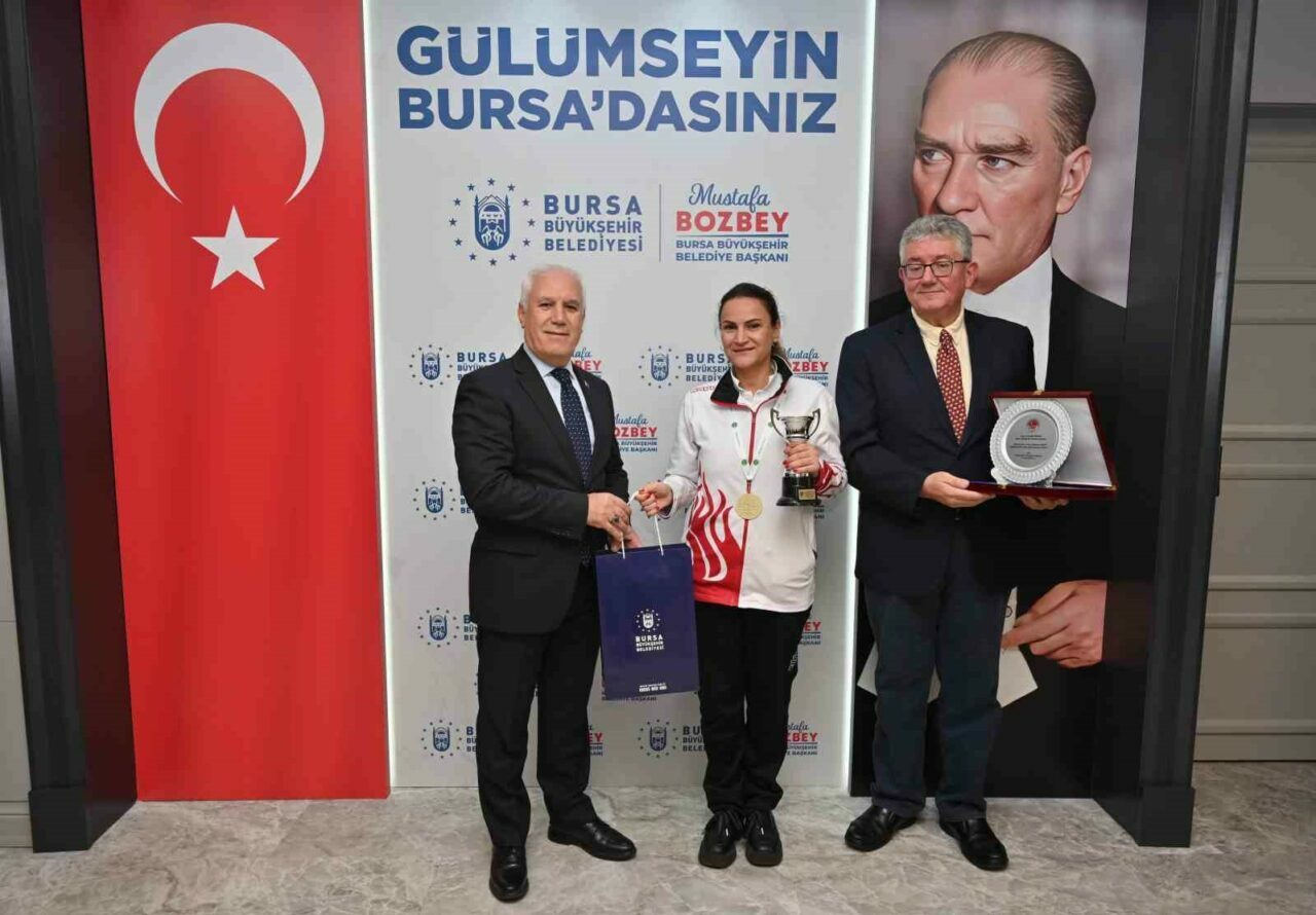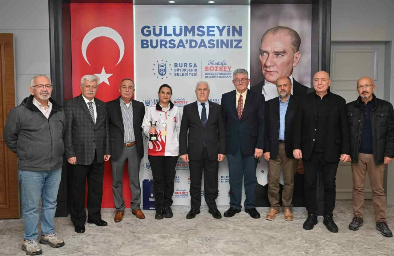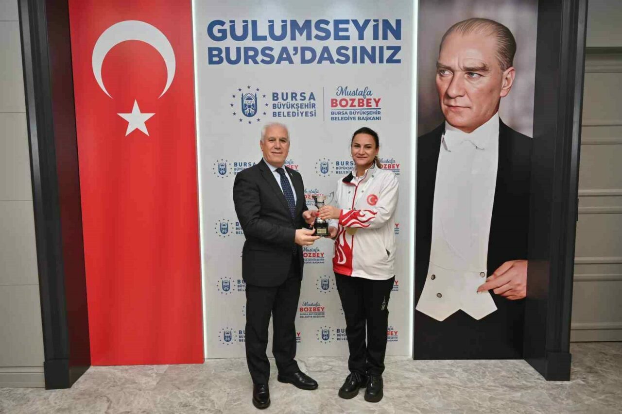 Bursa Büyükşehir Belediye Başkanı Mustafa Bozbey, dünya şampiyonluğu yaşayan Dilek Yavaş’ı makamında ağırlayarak tebrik etti.