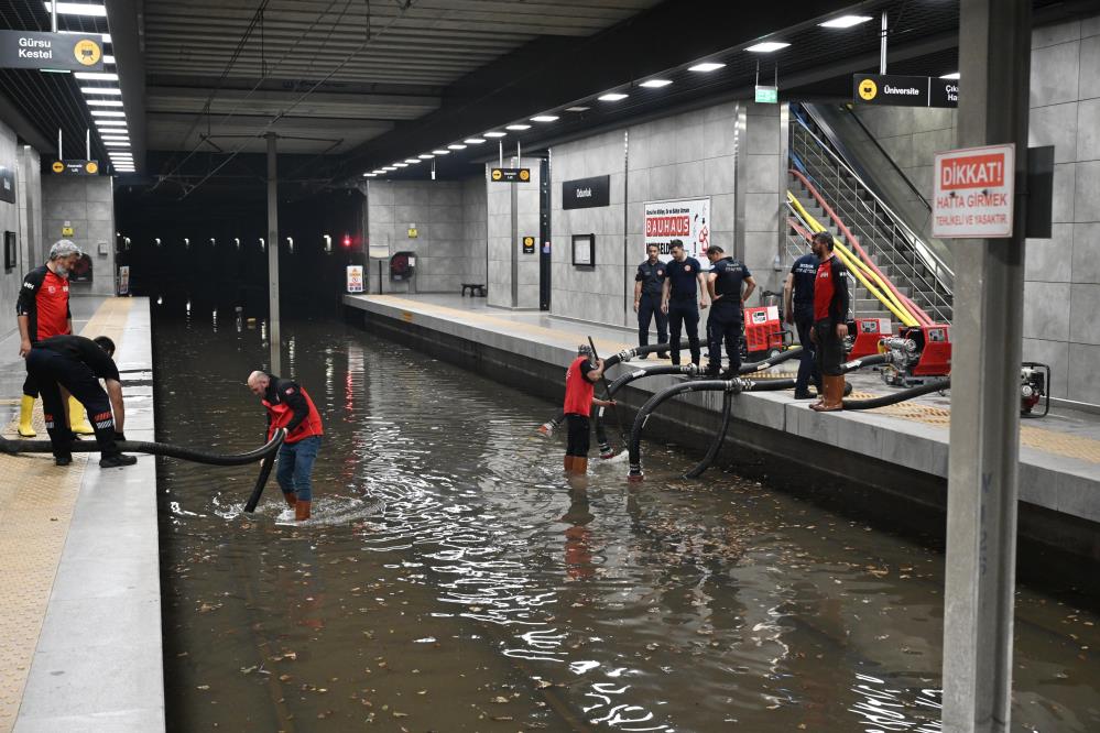 Odunluk İstasyonu’ndaki su tahliye çalışmalarını yerinde inceleyen Başkan Mustafa Bozbey, Büyükşehir Belediyesi Genel Sekreteri Doç. Dr. Ergül Halisçelik ile birlikte Burulaş Genel Müdürü Fahrettin Beşli ve BUSKİ Genel Müdürü Güngör Gülenç’ten son durum hakkında bilgi aldı.