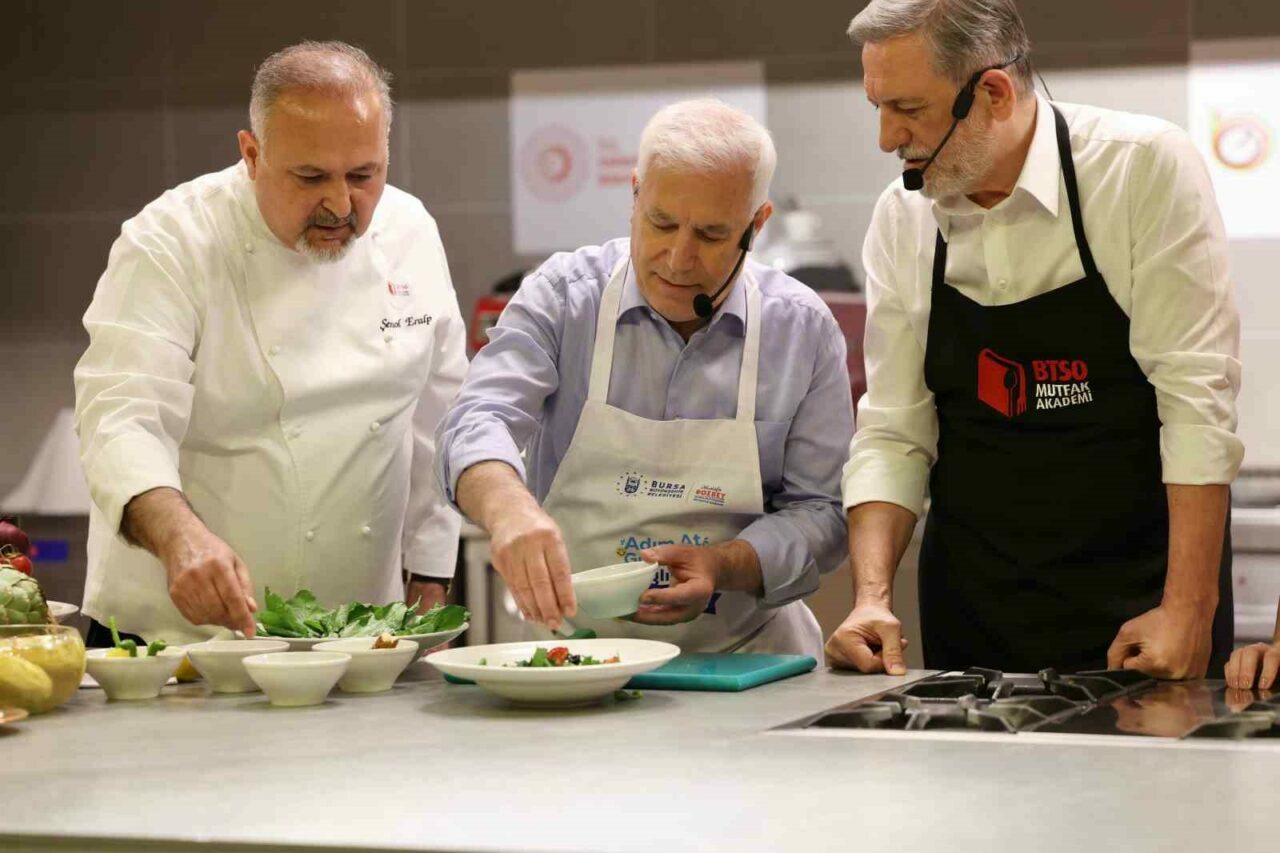 Proje kapsamında Bursa Büyükşehir Belediye Başkanı Mustafa Bozbey ve eşi Seden Bozbey, mutfak önlüklerini takıp BTSO Yönetim Kurulu Başkanı İbrahim Burkay ile birlikte mutfağa girdi. BTSO Mutfak Akademi’de usta şefler Barış Uysal ve Şenol Eralp rehberliğinde, hem lezzetli hem de sağlıklı bir alternatif olan Enginarlı Fit Salata hazırlayan Mustafa Bozbey ve Seden Bozbey, mutfaktaki yetenekleriyle usta şeflerden tam not aldı.