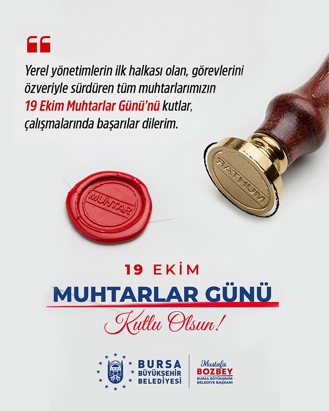 Başkan Bozbey mesajında, “Mahallelerimizin sesi, dayanışmanın gücü olan tüm muhtarlarımızın 19 Ekim Muhtarlar Günü’nü kutluyorum. Katılımcı, adil ve insan öncelikli kent yönetiminde en büyük yol arkadaşlarımız sizlersiniz. Birlikte üretiyor, birlikte yönetiyoruz” ifadelerini kullandı.