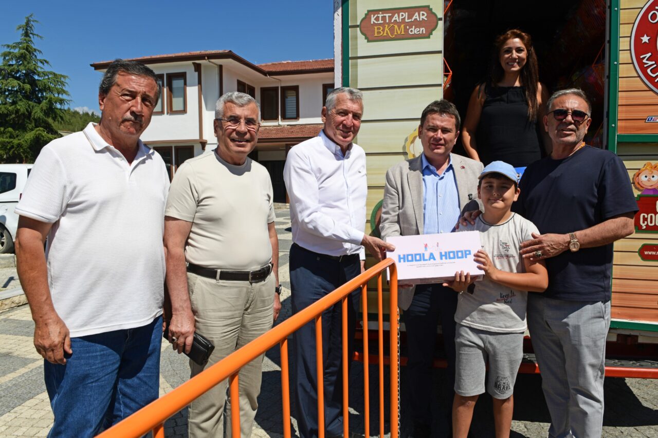 Başkan Erkan Aydın, Harmancık ziyaretinde çocukların gönlünde taht kuran Muhsin Abiyle birlikte çocuklara oyuncak dağıttı.