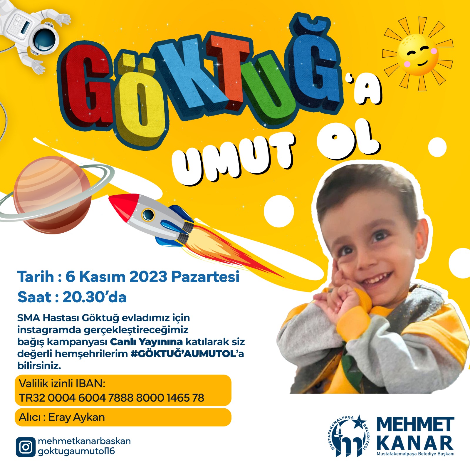 2.5 yaşında SMA Tip 2 kas hastalığıyla mücadele eden Göktuğ için seferber olan Başkan Kanar, ‘’Göktuğ’a umut ol’’ kampanyasına destek için Göktuğ Aykan’ın ailesi ile birlikte sosyal medya canlı yayınına katılarak 30 Bin TL bağışta bulundu. Gerekli tedaviyi görebilmesi için 1.8 milyon dolar 56 milyon TL ye ihtiyacı olan Göktuğ için konuşma yapan Başkan Kanar ‘’ Bol bağışlı, bol paralı Göktuğ için kendimizi feda ettiğimiz bir akşam olsun. Öncelikle bizim hesabımızdan yapılan bir paylaşım var. Öncelikle ben 30 Bin TL ile başlayalım. Çok kuvvetli bir şekilde bu işe girdiniz. Göktuğ bizim çocuğumuz bu destekleriniz için çok teşekkür ediyorum. Allah yardımlarımızı kabul etsin. Herkesten azami miktarda Göktuğ çocuğumuz için destek bekliyoruz. Zira süremiz sınırlı. Valiliğimizin izniyle inşallah kısa sürede bu parayı toplayacağız, bu kardeşimize yardımcı olacağız. Rabbim yar ve yardımcımız olsun. Göktuğ’a hem elimizle, hem dilimizle yanınızdayız.