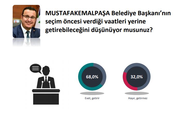 Anketin en dikkat çeken sorunlarından birisi ise “Belediye Başkanı’nın seçim öncesi verdiği vaatleri yerine getirebileceğini düşünüyor musunuz?” olurken yüzde 68’le Başkan Mehmet Kanar’a güveninin tam olduğu mesajı ortaya çıktı.
