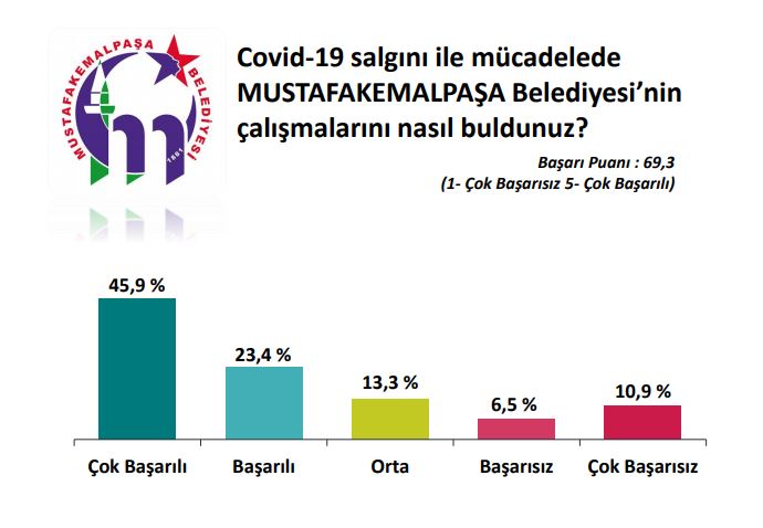 Mustafakemalpaşa Belediyesi tarafından sunulan hizmetleri ve (COVİD-19) salgını ile ilgili mücadelede gerçekleştirilen çalışmaları değerlendiren katılımcılar ankete yüzde 69 olumlu yanıt verdi.