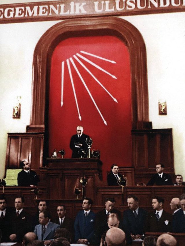 Başkan Bozbey’in paylaşımında Gazi Mustafa Kemal Atatürk’ün TBMM’de yaptığı bir konuşma ve arkasında CHP’nin simgesi altı ok yer alıyor…