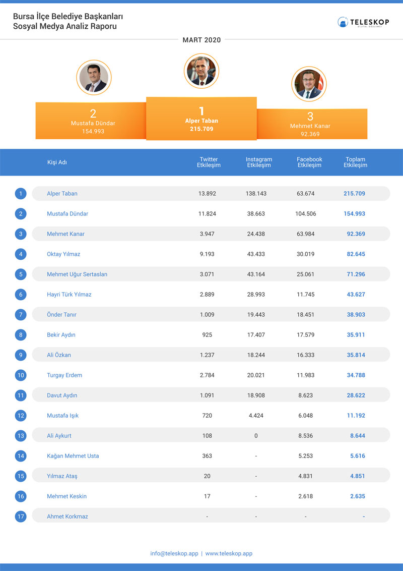 Dijital medya gözlemi gerçekleştiren Teleskop’un istatistiklerine göre Mart ayı içerisinde 3 mecrada toplam 384 paylaşım yapan İnegöl Belediye Başkanı Alper Taban, Bursa’daki İlçe Belediye Başkanları arasında 1. sırada yer aldı. İkinci sırayı ise 134 paylaşımla Mehmet Uğur Sertaslan Üçüncü sırayı ise Mustafa Dündar aldı.