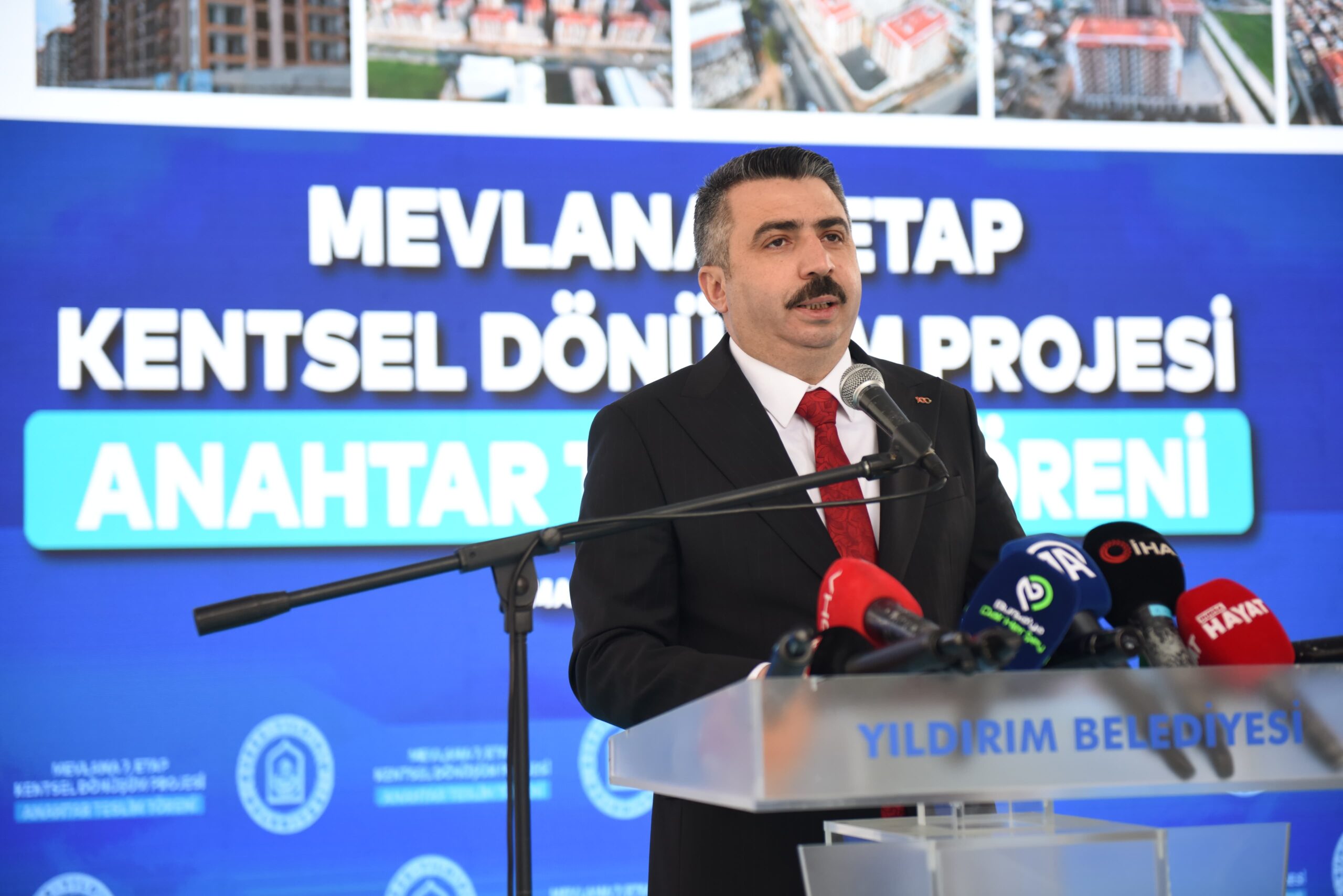 Yıldırım’ın en önemli kentsel dönüşüm alanlarından birisi olan Mevlana’da hak sahiplerine anahtarlarını teslim etmenin mutluluğunu yaşadıklarını dile getiren Başkan Yılmaz, “Mevlâna 7. Etap’ta 112 bin 949 metrekarelik inşaat alanına sahip alandaki, hak sahipleri yüzde 100 uzlaşma ile gerçekleştirdiğimiz projemizin bünyesinde 644 adet konut, 177 adet işyeri, 18 bin 261 metrekare kapalı otopark, 941 metrekare yürüyüş alanı, 3 bin 852 metrekare yürüyüş yolu, 3 bin 148 metrekare sosyal tesis alanı, 180 metrekare çocuk alanı ve 125 metrekare fitness alanı bulunuyor. Projemiz ile birlikte insanlarımıza sadece güvenli konutlar sağlamıyor, onların yaşamaktan keyif alacağı yaşam standartlarının yüksek olduğu yaşam alanları oluşturuyoruz. Projemizin hayırlı olmasını temenni ediyorum” diye konuştu.