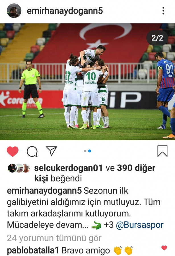 Sol bekte oynamasına rağmen, 58. gol perdesini açan Emirhan’ın, “Galibiyetten dolayı çok mutluyuz. Mücadeleye aynen devam” paylaşımının altına Bursaspor’un efsane 10 numarası Pablo Martin Batalla, “Bravo Amigo” yazarak, eski takım arkadaşını kutladı.
