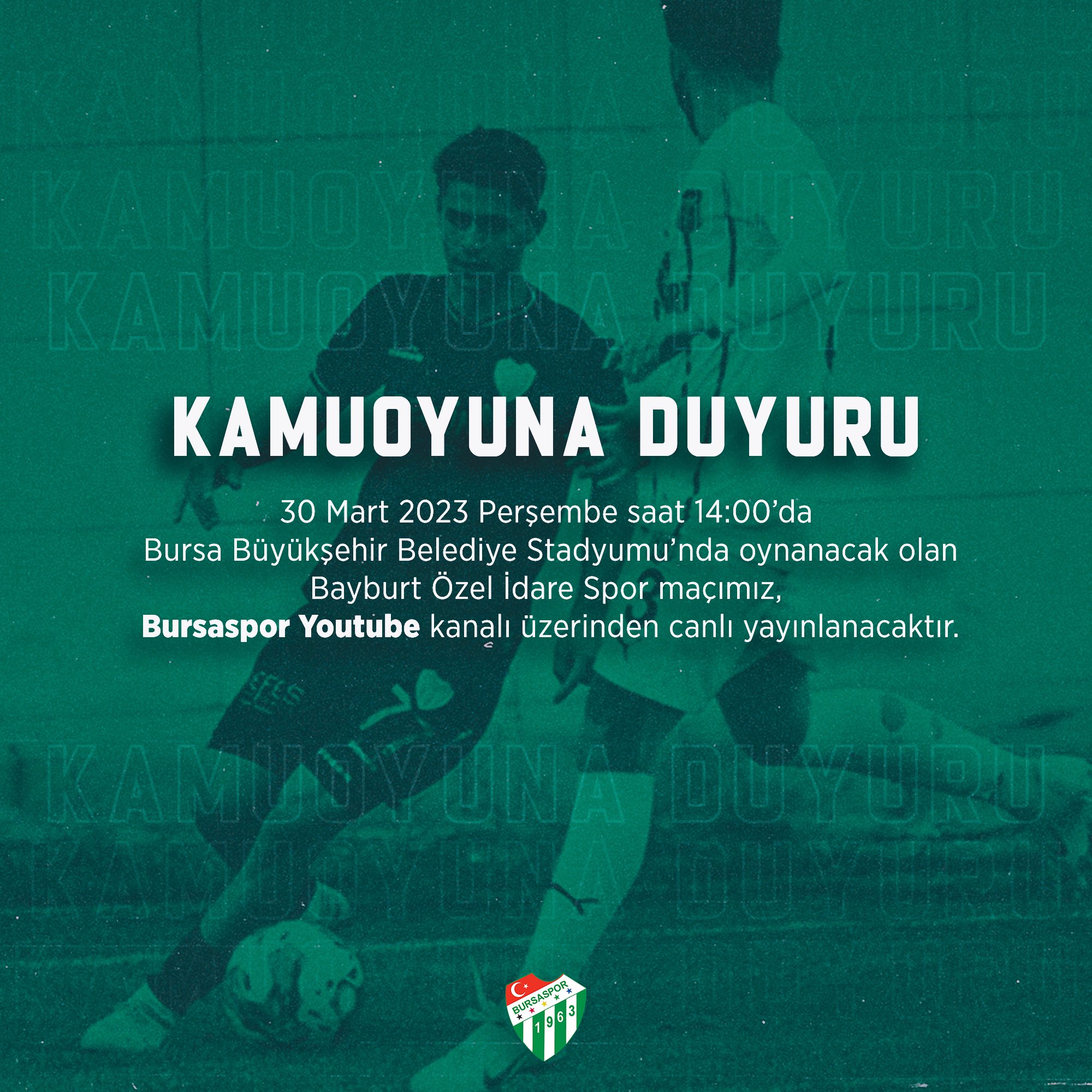 Ana Sayfa › Final › Bursaspor › Bayburt maçı nerede yayınlanacak? Bursaspor açıkladıBayburt maçı nerede yayınlanacak? Bursaspor açıkladı Bursaspor Kulübü, yarın saat 14.00’te Bursa Büyükşehir Stadı’nda oynanacak olan Bayburt İ.Ö. maçının Bursaspor Youtube hesabından canlı yayınlanacağını duyurdu. Giriş: 29-03-2023 13:25Güncelleme: 29-03-2023 17:52Kaynak: BursasporFinal ABONE OL + - HABERİ PAYLAŞ