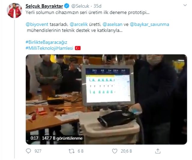 Bayraktar, “Birlikte Başaracağız” ve “Milli Teknoloji Hamlesi” etiketleriyle yaptığı paylaşımında, “Yerli solumun cihazımızın seri üretim ilk deneme prototipi… @biyovent tasarladı, @arcelik üretti, @aselsan ve @baykar_savunma mühendislerinin teknik destek ve katkılarıyla…” ifadelerini kullandı.