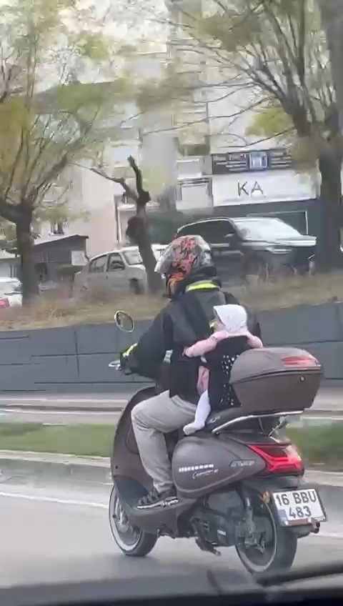Motosiklet sürücüsü baba, bebeğini arkasına bağlayarak kilometrelerce ilerledi.