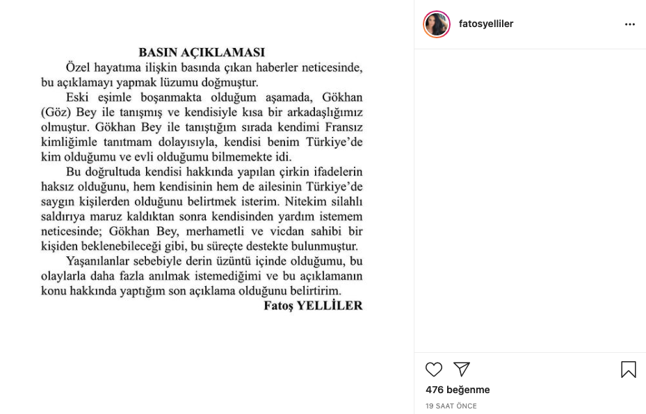 Bu doğrultuda kendisi hakkında yapılan çirkin ifadelerin haksız olduğunu, hem kendisinin hem de ailesinin Türkiye’de saygın kişilerden olduğunu belirtmek isterim. Nitekim silahlı saldırıya maruz kaldıktan sonra kendisinden yardım istemem neticesinde; Gökhan Bey, merhametli ve vicdan sahibi bir kişiden beklenebileceği gibi, bu süreçte destekte bulunmuştur. Yaşanılanlar sebebiyle derin üzüntü içinde olduğumu, bu olaylarla daha fazla anılmak istemediğimi ve bu açıklamanın konu hakkında yaptığım son açıklama olduğunu belirtirim.”