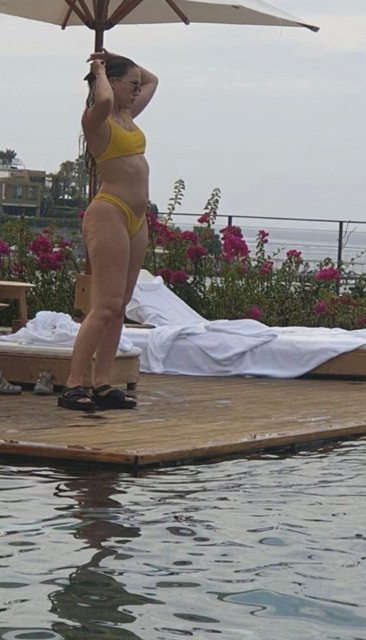 Güneşin tadını çıkaran Özaslan, önceki gün havuz kenarında görüntülendi.