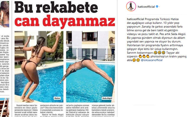 Şarkıcı Hatice, Seda Akgül’ün bu pozlarına ‘taklit’ diyerek tepki gösterdi. Bir gazetede yer alan haber küpürünü paylaşan Hatice, ‘Programda Türkücü Hatice der,aşağılayıcı üslup kullanır. 10 yıldır pop yapıyorum.