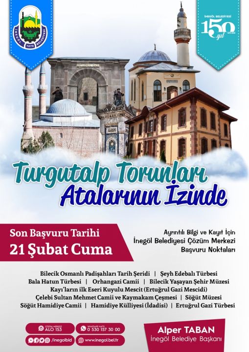 ‘Turgutalp Torunları Atalarının İzinde’ mottosuyla düzenlenecek olan gezilerin kayıtları yarın (18 Şubat 2020 Salı) başlayacak. 21 Şubat 2020 Cuma gününe kadar devam edecek kayıtların ardından, gezinin startı ise 02 Mart 2020 Pazartesi günü verilecek. Ramazan ayına kadar tamamlanması planlanan gezilerde, İnegöl Belediyesi tarafından ulaşım hizmeti yanında kumanya desteği de verilecek. Ayrıca Bilecik ve Söğüt Belediyelerinin de rehber desteği vereceği açıklandı.