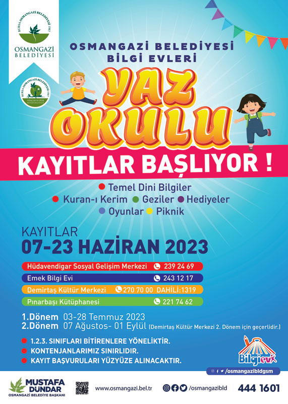 Sosyal hayatın gelişimine katkı sağlayarak kültürel faaliyet alanları oluşturan Bilgi Evleri’nin yaz dönemi boyunca tüm öğrencileri beklediğini belirten Osmangazi Belediye Başkanı Mustafa Dündar, bu yıl eğitimlerin Hüdavendigar Sosyal Gelişim Merkezi, Emek Bilgi Evi, Demirtaş Kültür Merkezi ile Pınarbaşı Kütüphanesi’nde gerçekleşeceğini belirtti. Temel dini bilgiler ve Kur’an-ı Kerim’in yanı sıra öğrencilerin geziler, hediyeler, oyunlar ve pikniklerle hoşça vakit geçireceğini söyleyen Dündar, “Bizler, çocuklarımızın ve gençlerimizin gelişimine katkı sağlayacak projeler ortaya koyuyoruz. Geleceğimizin teminatı, güçlü Türkiye’mizin mimarı olacak evlatlarımızın daha iyi eğitim almaları için elimizden gelen tüm desteği veriyoruz. Bilgi Evleri’nden faydalanmak isteyen 1, 2 ve 3. sınıfları bitiren evlatlarımız, 07-23 Haziran tarihleri arasında kurs merkezlerimizden kayıt yaptırabilir. Vaktini değerli geçirmek isteyen öğrencilerimizi davet ediyorum” dedi.