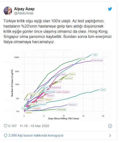 “Türkiye kritik olgu eşiği olan 100’e ulaştı. Az test yaptığımızı, hastaların %20’sinin hastaneye gelip tanı aldığı düşünürsek kritik eşiğe günler önce ulaşmış olmamız da olası. Hong Kong, Singapur olma şansımızı kaybettik. Bundan sonra tüm enerjimizi İtalya olmamaya harcamalıyız.