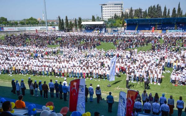 Karacabey Fehmi Gerçeker Stadyumu’nda gerçekleştirilen organizasyonda öğrenciler, Belediye Başkanı Ali Özkan ve protokol üyeleri ile birlikte aynı anda kitap okudu.