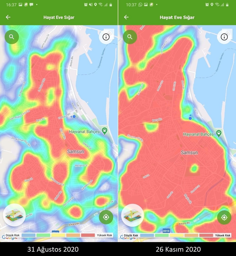 Samsun’da ‘Hayat Eve Sığar Uygulaması’ndan (HES) 31 Ağustos ve 26 Kasım tarihlerinde 3 ay zaman aralığıyla alınan görüntüler koronavirüste vaka artışlarını gözler önüne serdi. 3 ay önce diğer renklerin de görülebildiği haritada şimdilerde ‘yüksek risk’i temsil eden kırmızı renk yoğunluğu dikkat çekiyor. Şehir, uygulamadan bakıldığında kıpkırmızı halde bulunuyor.