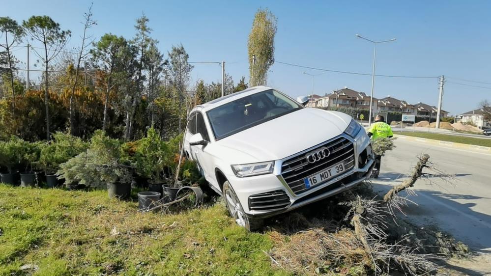 Sürücüsünün kontrolünden çıkan cip ise yol kenarında faaliyet gösteren peyzaj işletmesine girerek ağaç fidanlarının üzerinde askıda kaldı.