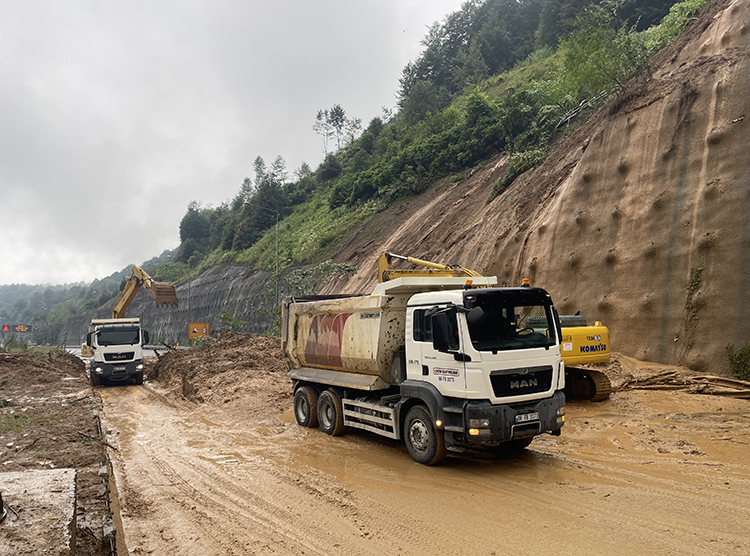 Kentte önceki gün etkisini göstermeye başlayan kuvvetli yağışın ardından dün Bolu Dağı Tüneli çıkışında yaşanan toprak kayması sonucu kapanan yolu açma çalışmaları, sabahın ilk ışıklarıyla başlatıldı.
