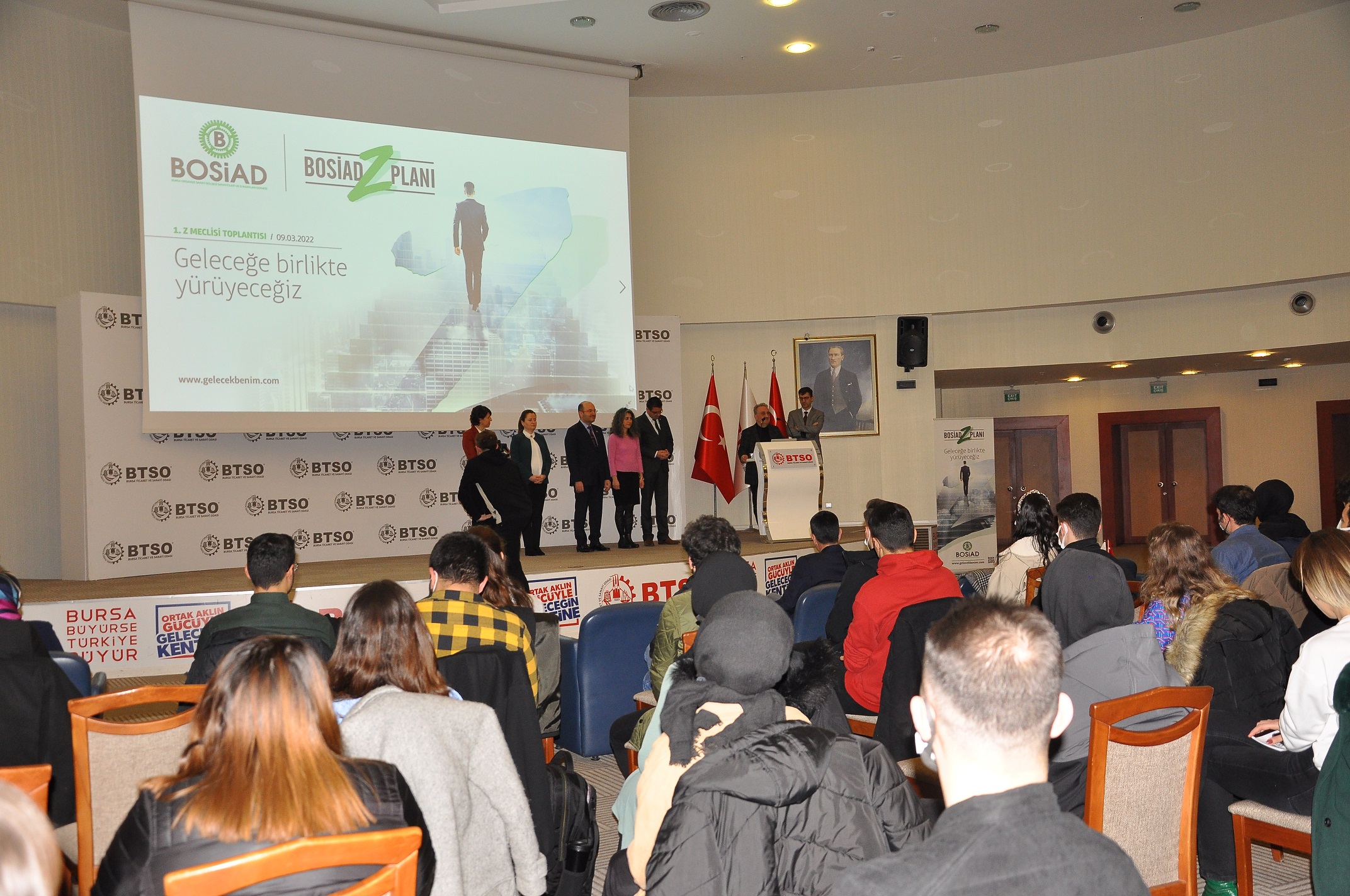 Bursa Organize Sanayi Bölgesi Sanayicileri ve İş İnsanları Derneği’nin (BOSİAD) Z kuşağını anlamak ve onlarla iş dünyası arasında bir bağ kurmak için başlattığı Z Planı kapsamında çalışan ve gelecekte çalışma hayatına katılacak gençlerden oluşan Z Meclisi, ilk toplantısını gerçekleştirdi. BOSİAD, Bursa Ticaret ve Sanayi Odası (BTSO), Bursa Uludağ Üniversitesi (BUÜ), Bursa Teknik Üniversitesi (BTÜ) ve Bursa İl Milli Eğitim Müdürlüğü iş birliğiyle yürütülen Z Meclisi’nde Başkanlığa Görkem Koç seçildi.
