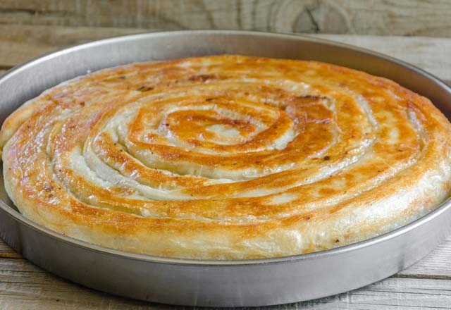Fırın tepsinizi hafif yağlayıp bir arada rulo yaptığımız hamuru ortadan başlayarak spiral şeklinde kapatın. Elde ettiğiniz rulonun üzerine tereyağı ve yoğurdu fırça yardımıyla sürün. Önceden ısıtılmış 180 derecelik fırında altı üstü kızarana kadar pişirin. Dilerseniz domatesle ikram edebilirsiniz.