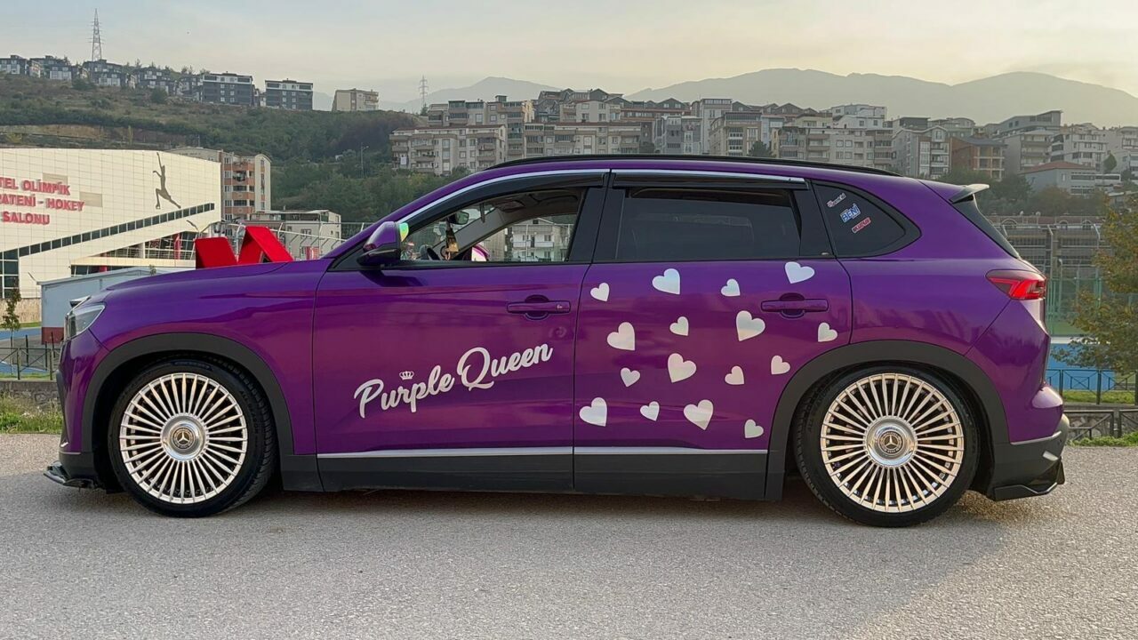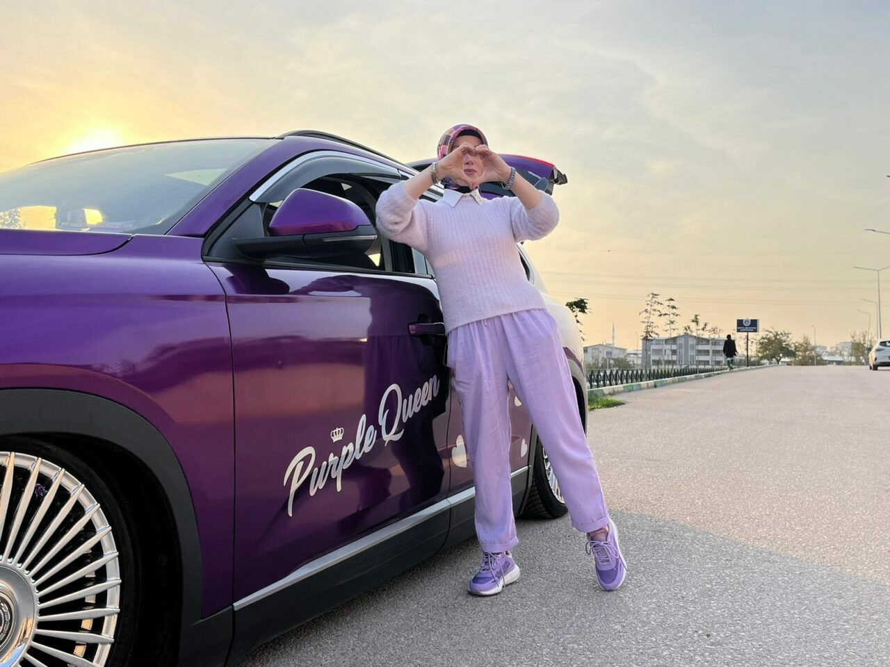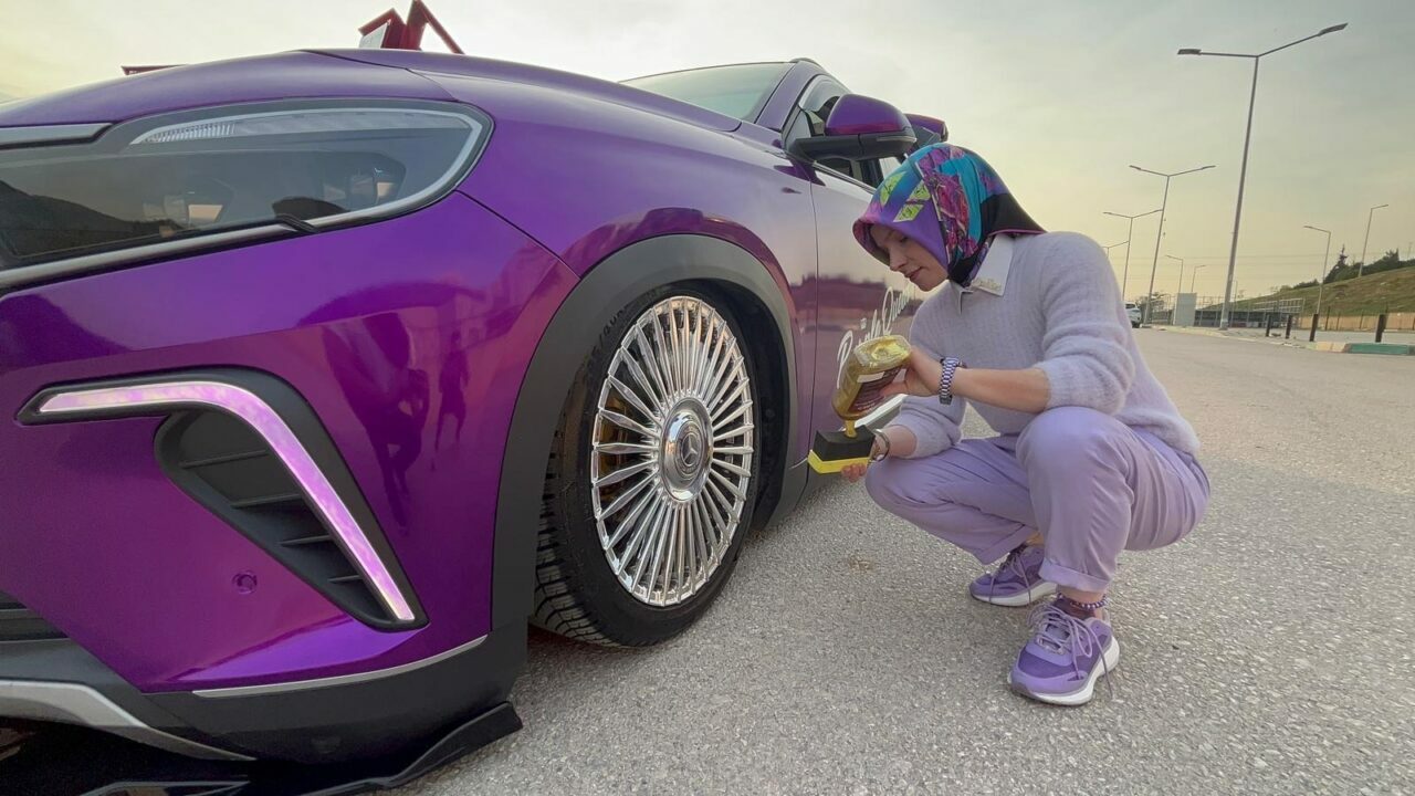 Son olarak yeni aldığı otomobilini de kahverengiden mora dönüştüren Firdevs Çakar, otomobilinin sadece dış kaplamasını değil; içini de mor renkli aksesuarlarla donattı.