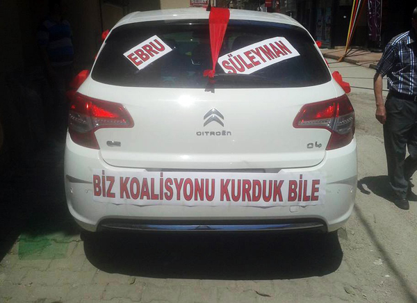 İnegöl’de bir başka düğün töreni de ilginç görüntülere sahne oldu. Ebru-Süleyman Koç çiftinin düğün arabasının arkasına yazılan ‘Biz koalisyonu kurduk bile’ sözü, seçimlerin ardından başlayan koalisyon tartışmalarını anımsattı.