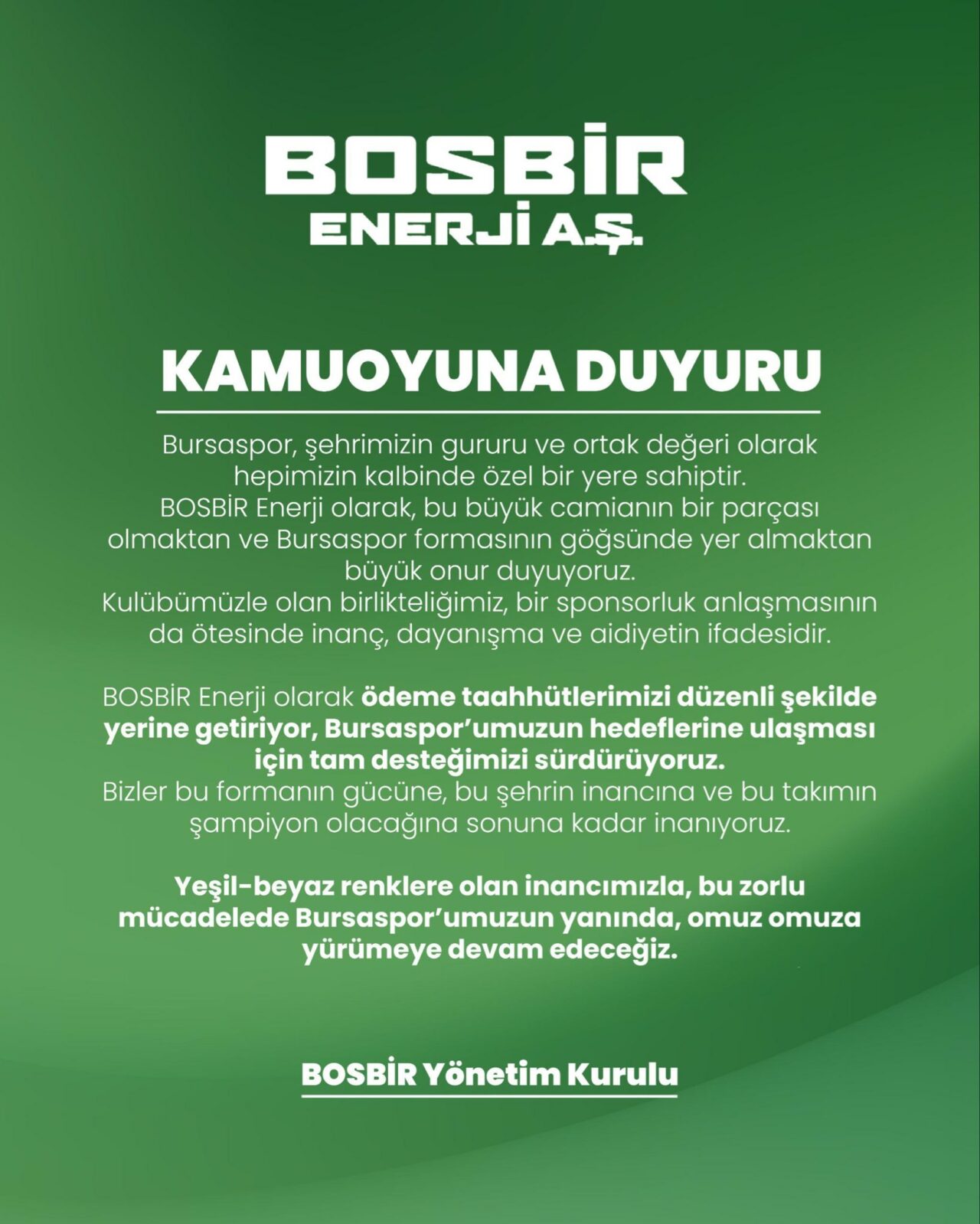 BOSBİR A.Ş.’nin kamuoyuna yaptığı açıklamada da belirtildiği üzere, Bursaspor’un forma göğüs sponsorluğu kapsamında verilen tüm taahhütler planlandığı şekilde, bölümler hâlinde ve eksiksiz olarak yerine getirilmektedir.