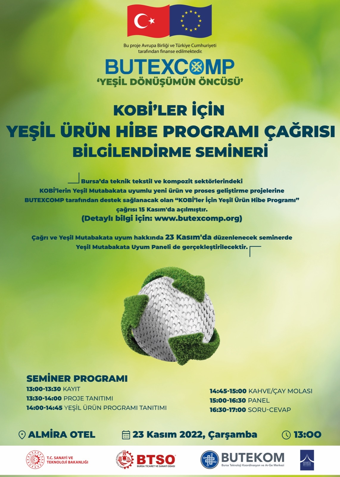 Yeşil Ürün Hibe Programı, Bursa’da kurulu teknik tekstil ve kompozit sektörlerindeki firmaların yeşil/çevreci/çevreye duyarlı/çevresel etkileri azaltan yeni ürün geliştirme projelerinin, BUTEXCOMP merkezi altyapısını kullanarak uzman personel ve gelişmiş altyapısı ile desteklenerek hayata geçirilmesi ve bölgeden yeni yeşil ürünlerin çıkması amacıyla tasarlandı. Seçilen KOBİ’lere verilen danışmanlık hizmetleri sonucunda minimum 5 farklı yeni yeşil ürün programı desteklenecek. Program ile seçilen KOBİ’ler için azalan girdi maliyetleri, artan ticarileştirme hacmi ve ihracat potansiyeli artışının sağlanması, teknik tekstil ve kompozit değer zincirinde ağ oluşumunun desteklenmesi amaçlanıyor.
