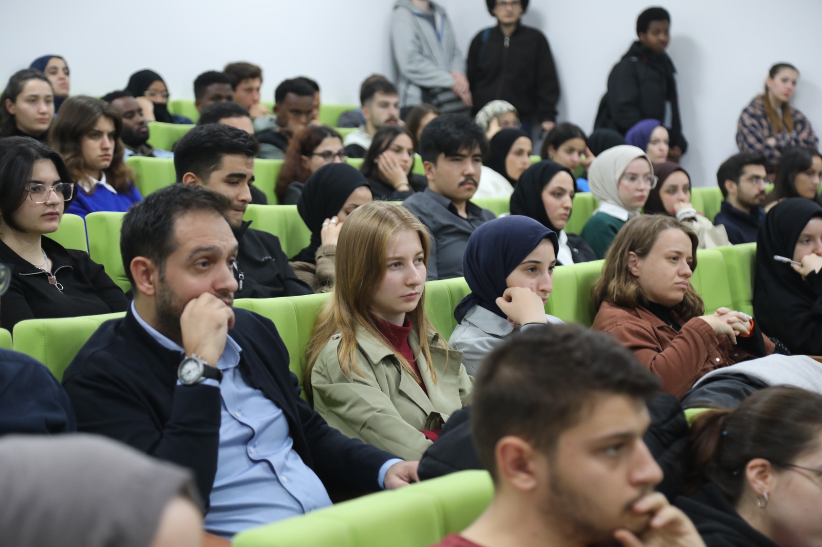 BTÜ Rektörü Prof. Dr. Naci Çağlar ve Rektör Yardımcısı Prof. Dr. Barış Tamer Tonguç’un da katıldığı konferansta konuşan Doç. Dr. Akdoğan, olayları hukuki, siyasi ve Türkiye açısından değerlendirdi. İsrail’in Filistin topraklarında, savaş ve soykırım suçu işlediğine dair ciddi delillerin olduğunu kaydeden Akdoğan, yargılamanın söz konusu olabileceğini ancak Uluslararası Ceza Mahkemesi’nin (UCM) buna cesaret edip edemeyeceğinin soru işareti olduğunu kaydetti. Akdoğan, “UCM Başsavcısı Kerim Han’ın ‘Her iki taraf da Filistin topraklarında savaş suçu işliyor’ açıklamasını İsrail’e bir gönderme olarak algılayabiliriz. Yani yargılanacaksa her iki taraf da yargılanacak. Bölgede deliller toplanıyor ancak İsrail ve ABD’nin soruşturma açılmasına engel olacağını düşünüyorum. Çünkü uluslararası hukuk, güçlü devletlerin çıkarları söz konusu olduğunda geçerlidir, zayıf devletler ise uymakla mükelleftir. Ancak uluslararası hukuk nezdinde tüm devletlerin, ‘İsrail’in bir terör devleti gibi hareket ettiğini’ söyleyerek kamuoyu oluşturması şart, aksi takdirde İsrail bu uygulamalarına devam edecek” dedi.