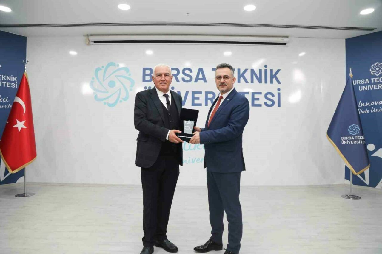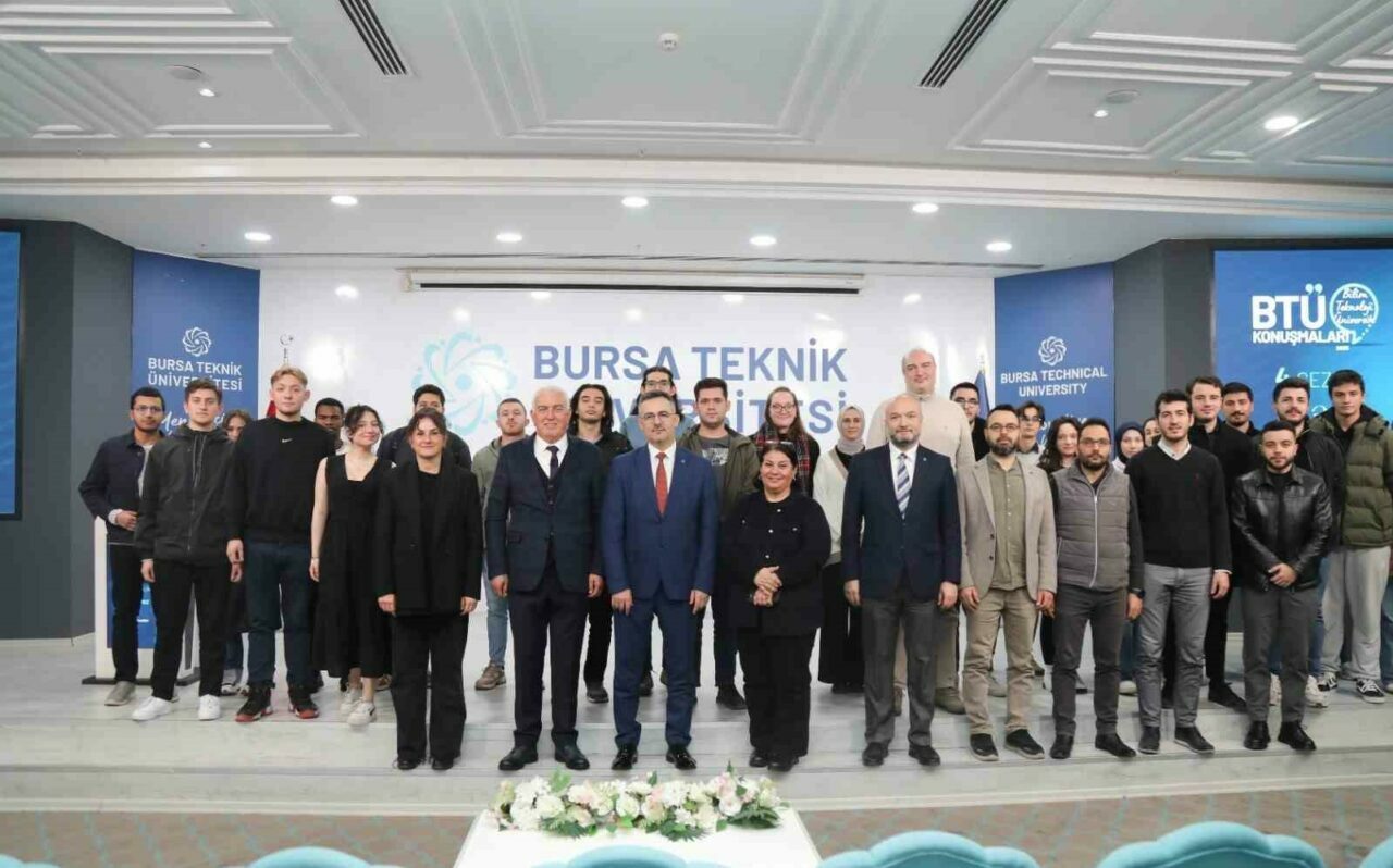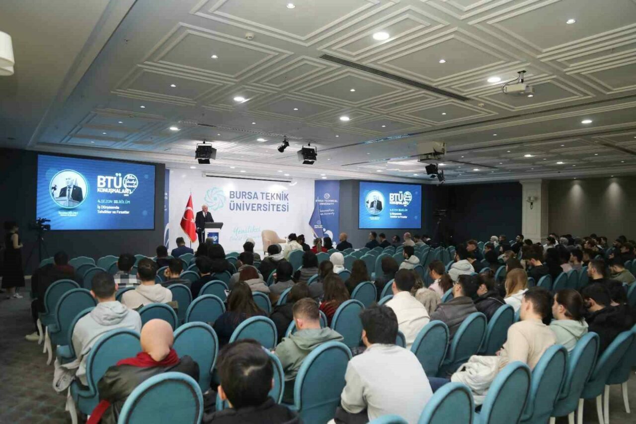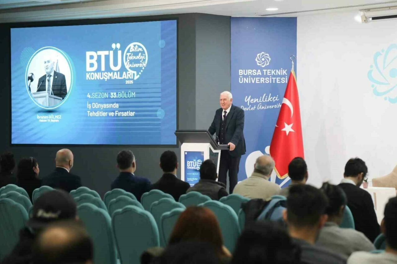 Bursa Teknik Üniversitesi öğrencileri, BTÜ Konuşmaları programıyla alanında uzman isimlerle buluşmaya devam ediyor. Bu doğrultuda her çarşamba günü Mimar Sinan Yerleşkesi Turkuaz Salon’da gerçekleşen BTÜ Konuşmaları’nın 4’ncü sezon 33’ncü bölüm konuğu, Haksan Otomotiv Yönetim Kurulu Başkanı İbrahim Gülmez oldu. Programa; BTÜ Rektörü Prof. Dr. Naci Çağlar, Rektör Yardımcıları Prof. Dr. Beyhan Bayhan ve Prof. Dr. Barış Tamer Tonguç, akademisyenler ile öğrenciler katıldı. “İş Dünyasında Tehditler ve Fırsatlar” başlıklı konuşmasını yapan Haksan Otomotiv Yönetim Kurulu Başkanı İbrahim Gülmez, sanayideki son gelişmeleri ve özel sektörde ihtiyaç duyulan mezun profilini paylaştı. Haksan Otomotiv’in BTÜ ile güçlü bir ilişkisi olduğunu vurgulayan İbrahim Gülmez, mühendislik ağırlıklı bölümlerin üniversite bünyesinde yer almasının sanayici için büyük öneme sahip olduğunu söyledi. Bursa’nın sanayi açısından büyük potansiyeller barındırdığını, özellikle otomotiv sektörünün öncü olduğunu ifade eden İbrahim Gülmez, mühendislik öğrencilerinin sanayi ile ilişkisinin artması gerektiğinin altını çizdi.