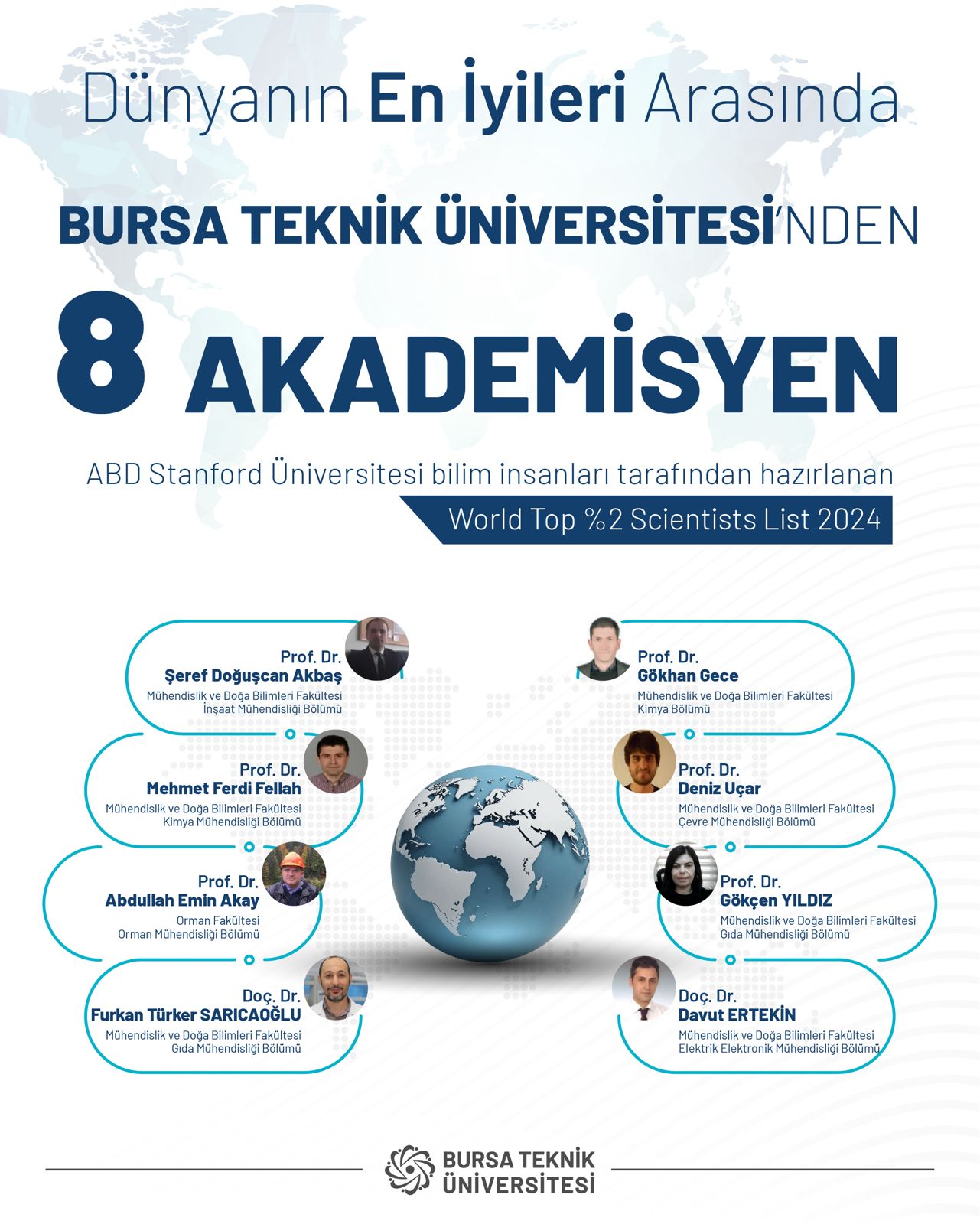 Amerika Birleşik Devletleri (ABD) Stanford Üniversitesi ve Elsevier Yayınevi tarafından hazırlanan ‘World Top %2 Scientists List 2024’ (Dünyanın En Etkili Bilim İnsanları Listesi) açıklandı. Atıf sayısı, h-indeksi ve hm-indeksi gibi ölçütler dikkate alınarak oluşturulan listede, bilim dünyasında önemli etki yaratan araştırmacılar yer aldı. Bir yıllık bilimsel üretkenlik ve etki üzerinden yapılan değerlendirmede, yalnızca dünyadaki bilim insanlarının en seçkin %2’lik dilimi listeye dahil edildi. Daha önce 2022 listesinde 6, 2023 listesinde 7 akademisyeniyle yer alan Bursa Teknik Üniversitesi, bu yıl ise 8 akademisyeniyle listede yer alma başarısı gösterdi.