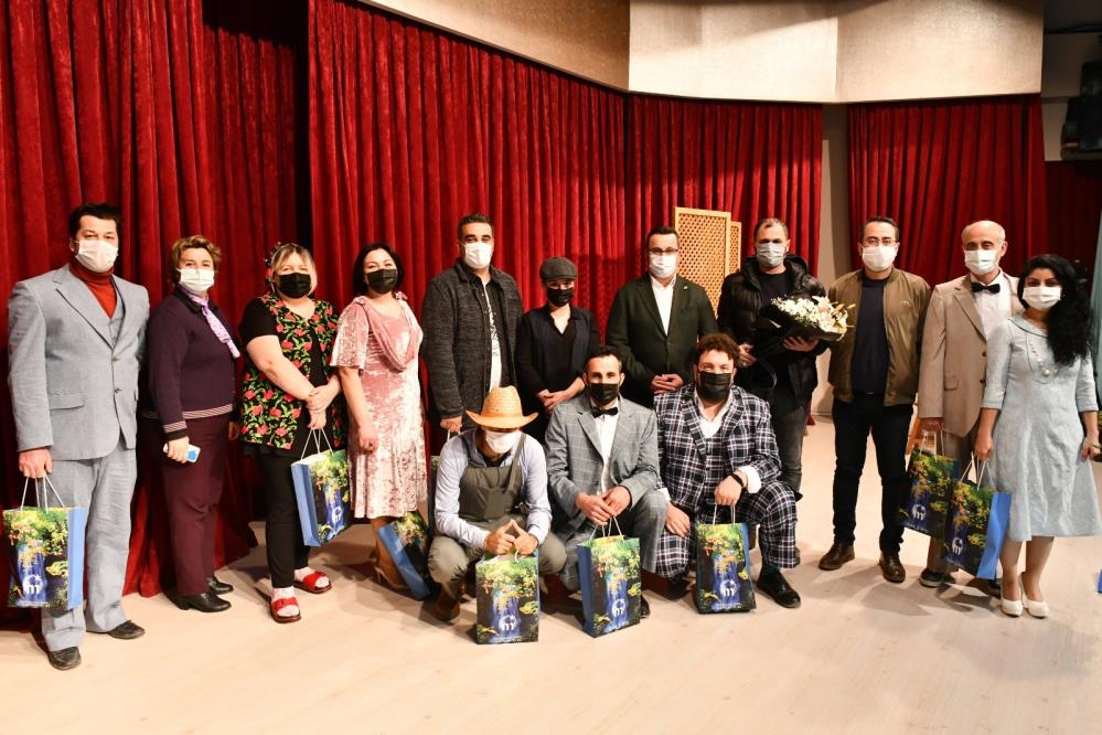 Tiyatro gününü kutlayan Belediye Başkanı Mehmet Kanar, oyunculara çeşitli hediyeler vererek hatıra fotoğrafı çektirdi.