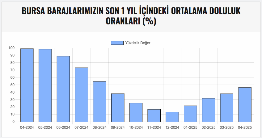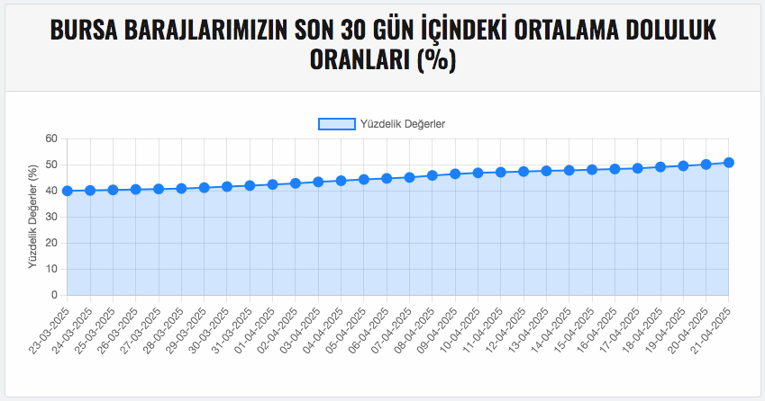 BUSKİ Genel Müdürlüğü verilerine göre, Bursa’ya içme suyu sağlayan barajların ortalama doluluk oranı yüzde 50,99 olarak kaydedildi.