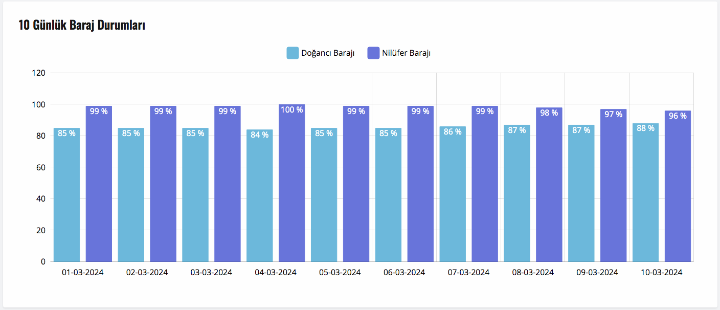 Bursa Büyükşehir Belediyesi Su ve Kanalizasyon İdaresi Genel Müdürlüğü’nün (BUSKİ) internet sitesindeki verilere göre; Doğancı Barajı’ndaki doluluk oranı yüzde 88, Nilüfer Barajı’ndaki doluluk oranı ise yüzde 96 olarak kaydedildi.