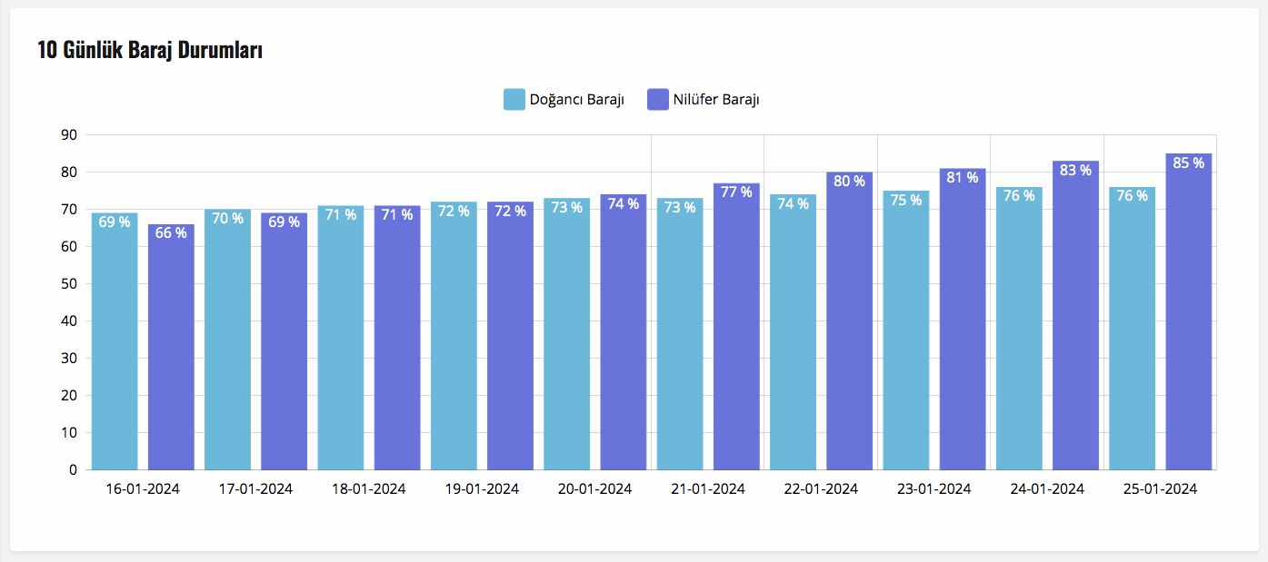 Bursa Büyükşehir Belediyesi BUSKİ Genel Müdürlüğü’nün internet sitesinden alınan verilere göre, Doğancı Barajı’ndaki doluluk oranı yüzde 76, Nilüfer Barajı’ndaki doluluk oranı ise yüzde 85 olarak belirtildi.