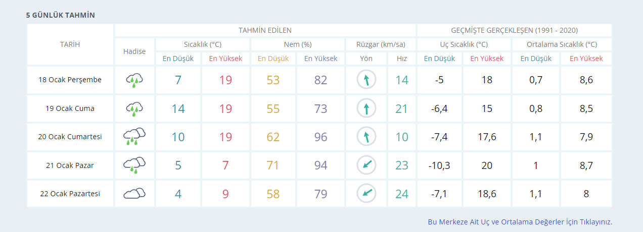 Meteoroloji Genel Müdürlüğü tarafından yapılan son değerlendirmelere göre: Ülkemiz genelinin parçalı ve çok bulutlu, Orta ve Doğu Akdeniz, İç Anadolu’nun güney ve doğusu, Orta ve Doğu Karadeniz (Samsun dışında), Doğu Anadolu’nun kuzey ve batısı, Güneydoğu Anadolu ile Antalya, Muş ve Bitlis çevrelerinin yağışlı geçeceği tahmin ediliyor. Yağışların, Osmaniye, Kahramanmaraş ve Hatay çevrelerinde kuvvetli, Antalya’nın doğu, Mersin’in batı kesimlerinde yer yer kuvvetli olması bekleniyor. Yağışların, genellikle yağmur ve sağanak, Doğu Karadeniz’in iç kesimleri, Doğu Anadolu’nun kuzeyi ile Muş ve Bitlis çevrelerinde karla karışık yağmur ve kar şeklinde olacağı tahmin ediliyor. İç ve batı kesimlerde pus ve sis, doğu kesimlerde buzlanma ve don olayı bekleniyor. Doğu Karadeniz’in iç kesimleri ile Doğu Anadolu’nun kuzey ve doğusunda çığ tehlikesi bulunmaktadır.