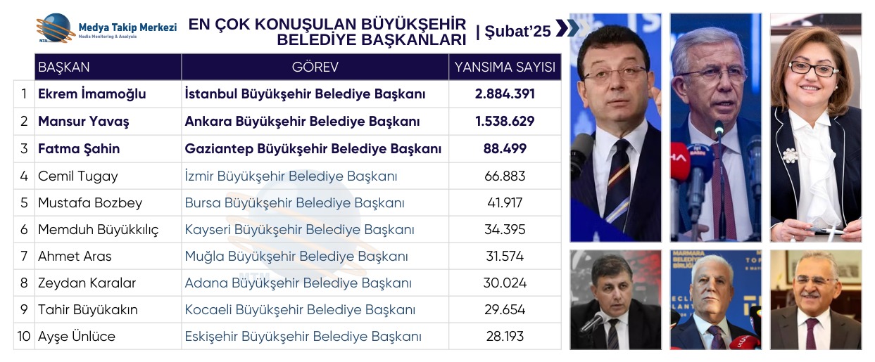 MTM Medya Takip Merkezi’nin internet, sosyal medya, televizyon ve yazılı basını kapsayan 10 bini aşkın kaynak üzerinden yaptığı araştırmaya göre, Şubat 2025, belediye başkanlarının projeleri, kararları ve siyasi açıklamalarıyla geniş yankı uyandırdığı bir ay oldu.