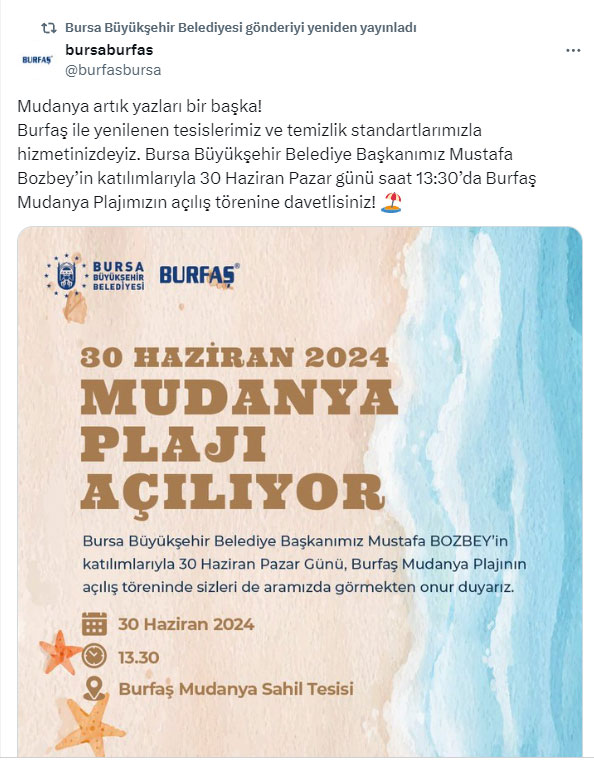 Burfaş ile yenilenen tesislerimiz ve temizlik standartlarımızla hizmetinizdeyiz. Bursa Büyükşehir Belediye Başkanımız Mustafa Bozbey’in katılımlarıyla 30 Haziran Pazar günü saat 13:30’da Burfaş Mudanya Plajımızın açılış törenine davetlisiniz! ️