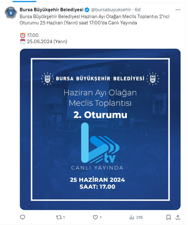 Bursa Büyükşehir Belediyesi Haziran Ayı Olağan Meclis Toplantısı 2’nci Oturumu 25 Haziran (Yarın) saat 17:00’da Canlı Yayında