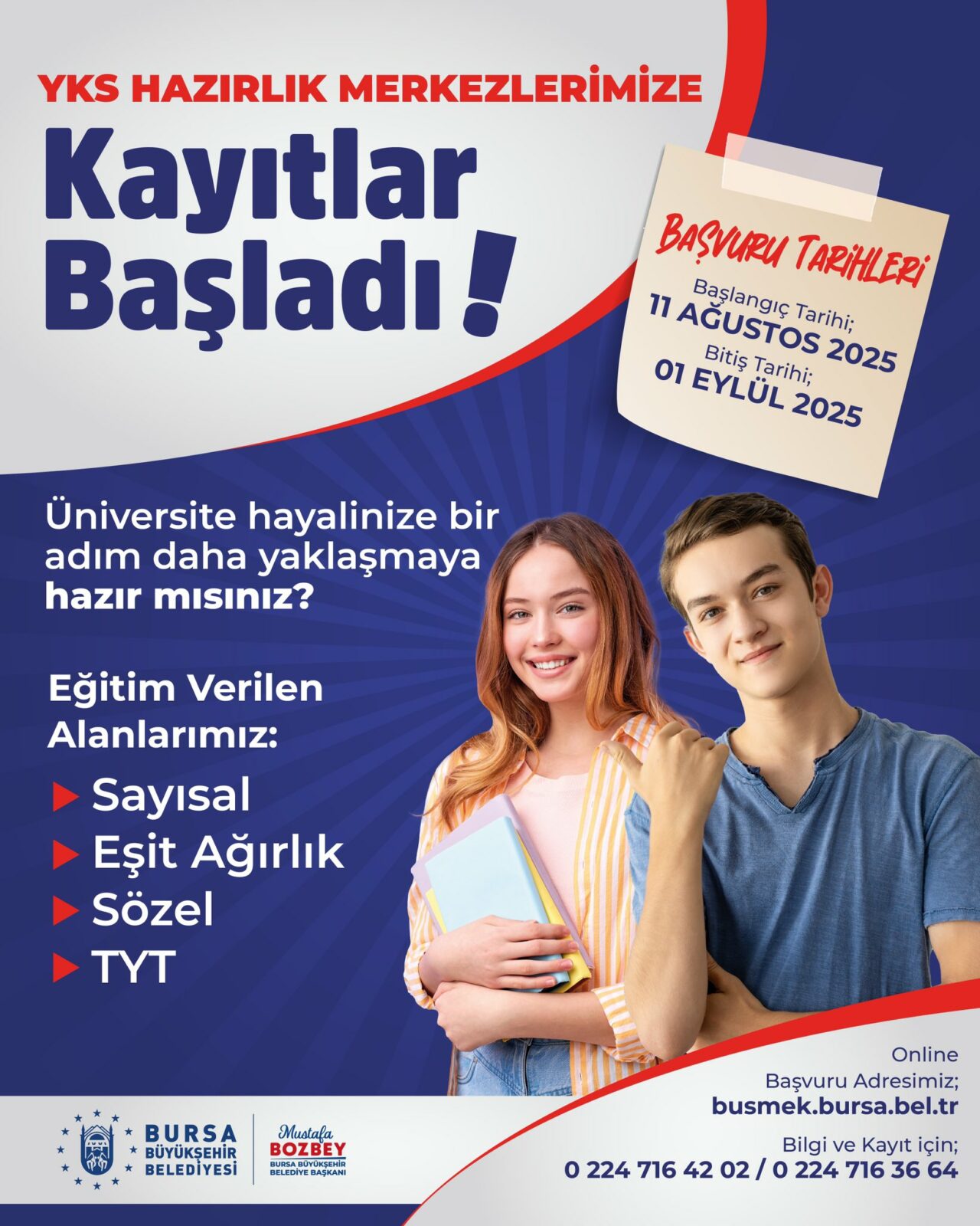 Bursa Büyükşehir Belediyesi olarak gençliğe desteğimizi kesintisiz sürdürüyor; üniversiteye hazırlık sürecindeki gençlerimize sunduğumuz ücretsiz YKS hazırlık kurslarımızın 2025-2026 eğitim-öğretim yılı kayıt sürecini başlatıyoruz. Başvuru dönemi: 11 Ağustos – 1 Eylül 2025