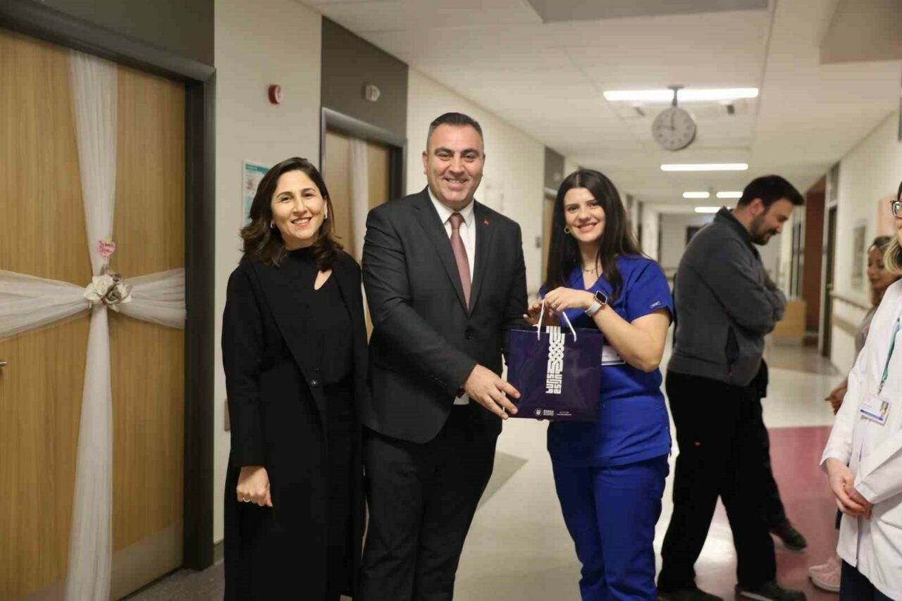 Başkanvekili Saldız ve eşi İpek Saldız, beraberindeki Başhekim Yardımcısı Dr. Burcu Günsoy ile birlikte hastane personeline çiçek ve çeşitli hediyeler verdi.