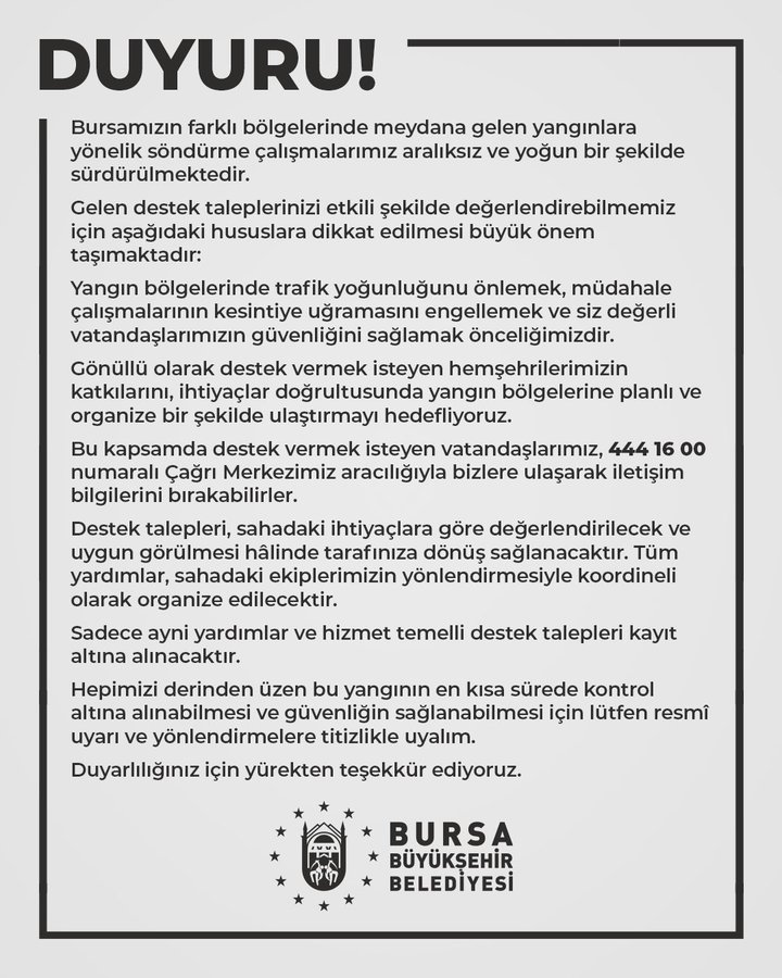 Ana Sayfa › Bursa › Bursa Büyükşehir’den önemli duyuruBursa Büyükşehir’den önemli duyuru Bursa Büyükşehir Belediyesi, yangın bölgelerine yönelik destek talepleri hakkında açıklamada bulundu… Giriş: 29-07-2025 16:26Güncelleme: 29-07-2025 17:15Kaynak: MELİSA ÖZTÜRER ÖZKAN Bursa ABONE OL + - Bursa Büyükşehir Belediyesi’nin duyurusu şöyle; HABERİ PAYLAŞ