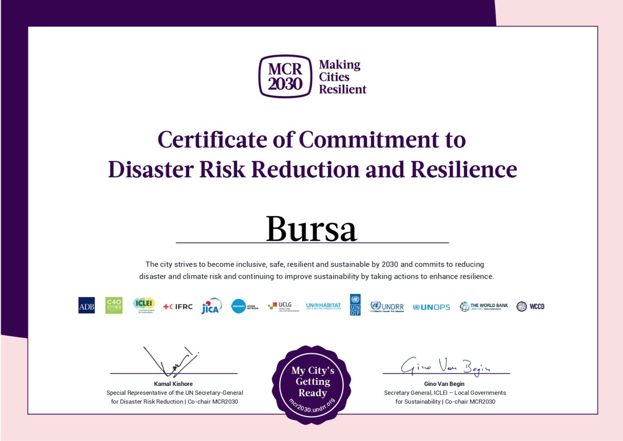 Bursa’yı daha güvenli, daha dirençli ve daha sürdürülebilir bir kent haline getirmek amacıyla çalışmalarını sürdüren Bursa Büyükşehir Belediyesi, dünya genelinde 1792 kentin üye olduğu BM bünyesindeki Afet Risk Azaltma Ofisi tarafından başlatılan ‘Making Cities Resilience 2030’ (MCR2030) (Şehirleri Dirençli Hale Getirmek) programına üye oldu. Kentsel Dönüşüm Dairesi Başkanlığı tarafından başvurulan programla, üye olan diğer ülkelerin kentleriyle çalışılarak, afet yönetiminde açık, şeffaf ve etkili mücadele sağlayacak bir yol haritasına da sahip olunacak. Ayrıca program kapsamında üye kentler arasında kullanılmakta olan donanım altyapısı, yazılım ve diğer teknik konular hakkında işbirliği de söz konusu olabilecek. Programa Türkiye’den üye olan 6 Büyükşehir Belediyesinden biri olan Bursa Büyükşehir Belediyesi, kenti afete dirençli hale getirme konusundaki kararlılığını sürdürüyor.