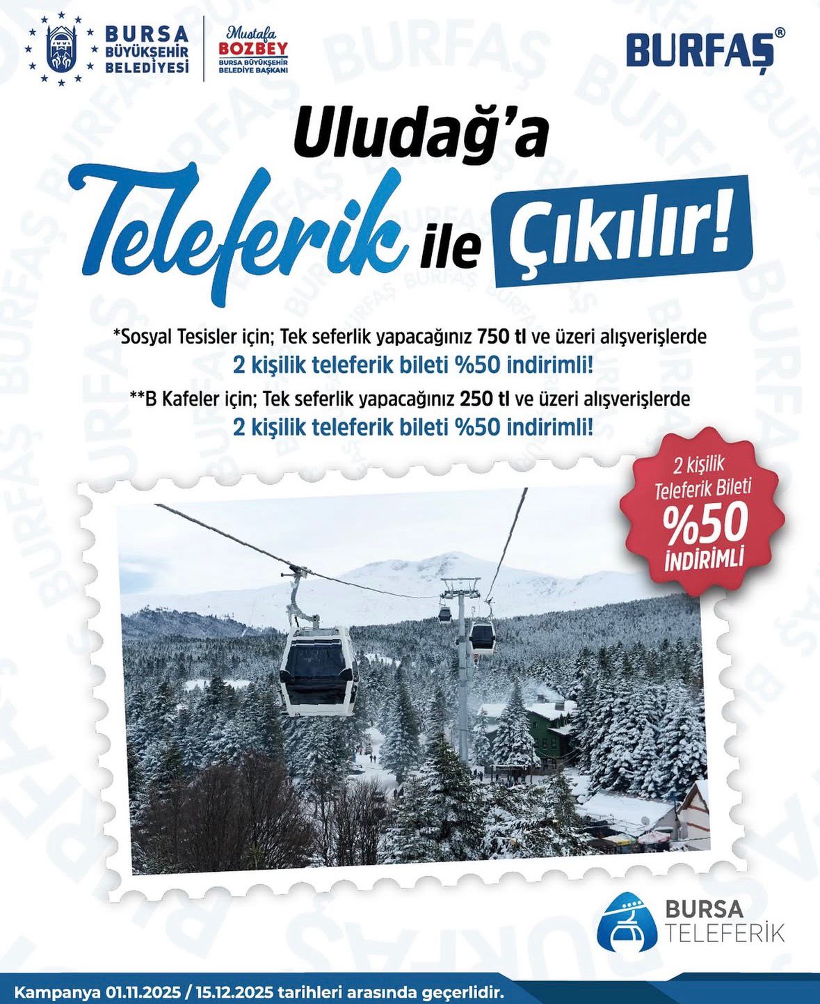 Bursa Büyükşehir Belediyesi ile BURFAŞ, kış sezonu öncesi Uludağ’a teleferikle çıkmak isteyen vatandaşlara özel bir kampanya başlattı. 1 Kasım–15 Aralık 2025 tarihleri arasında geçerli olacak uygulamayla, sosyal tesislerde ve B Kafeler’de belirlenen tutarlarda yapılan alışverişlere iki kişilik teleferik bileti yüzde 50 indirimli verilecek.