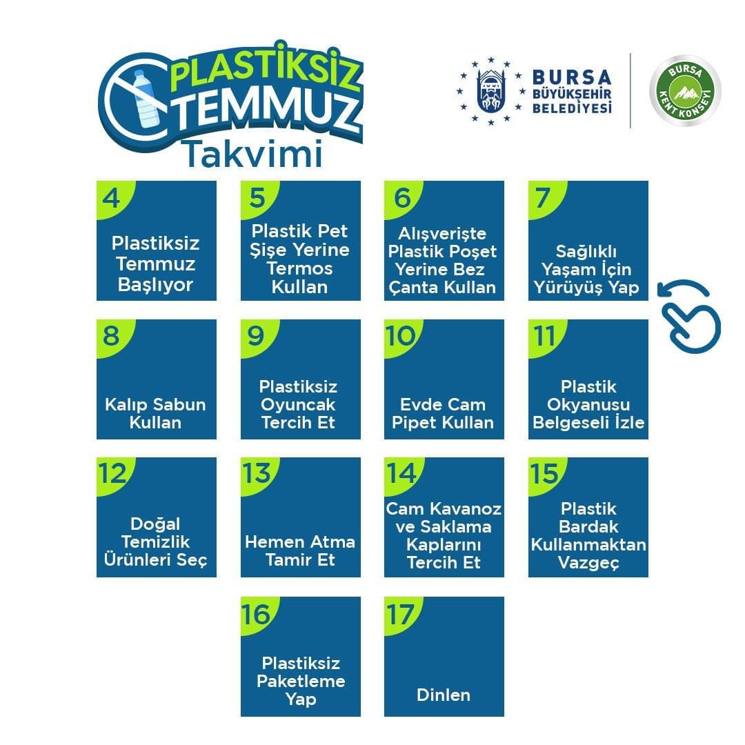 Bursa Büyükşehir Belediyesi de Çevre Koruma ve Kontrol Dairesi Başkanlığı ve Bursa Kent Konseyi ile birlikte plastik kullanımının azaltılması amacıyla ‘Plastiksiz Temmuz Hareketi’ne destek verme kararı aldı. Temmuz ayı boyunca tek kullanımlık plastiklerin kullanımının en aza indirilmesini amaçlayan Bursa Büyükşehir Belediyesi, yıl boyunca düzenleyeceği programlarla farkındalık oluşturarak doğanın temiz tutulmasını amaçlıyor.