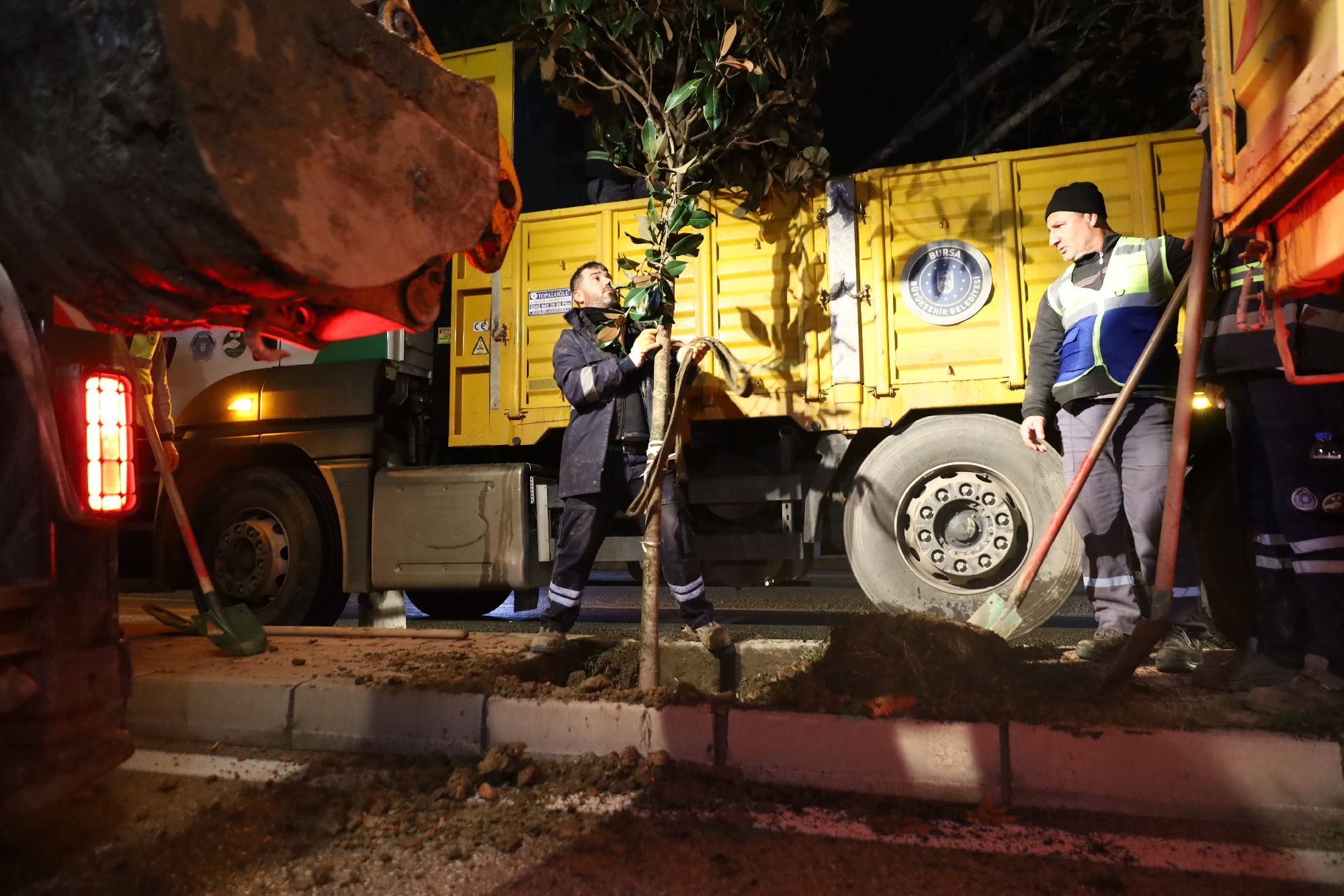 Bu çalışmalar kapsamında Nilüfer İlçesi Barbaros Caddesi’nde 16 personel, 2 iş makinesi ve 5 kamyonla sürdürülen çalışma ile orta refüj boydan boya 125 adet manolya ağacı ile donatıldı. Yine Nilüfer İlçesi Bilginler Caddesi’nde de 20 personelle 8 gece boyunca sürdürülen çalışma ile orta refüje 134 adet manolya ağacı dikildi.